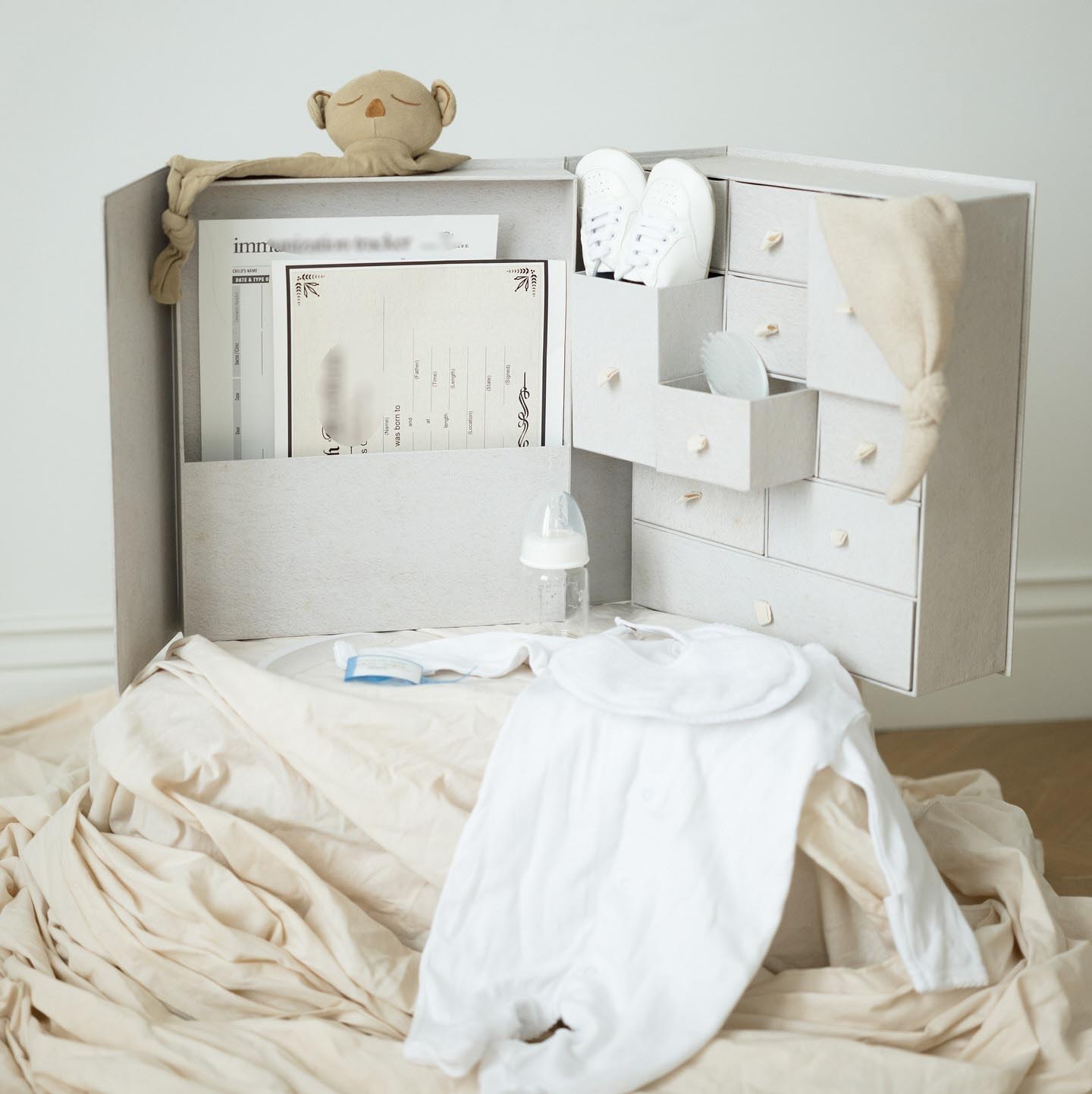 24 Customizable Drawers: Perfect for storing baby’s first curl, hospital bracelet, photos, birthday cards, and other cherished items.