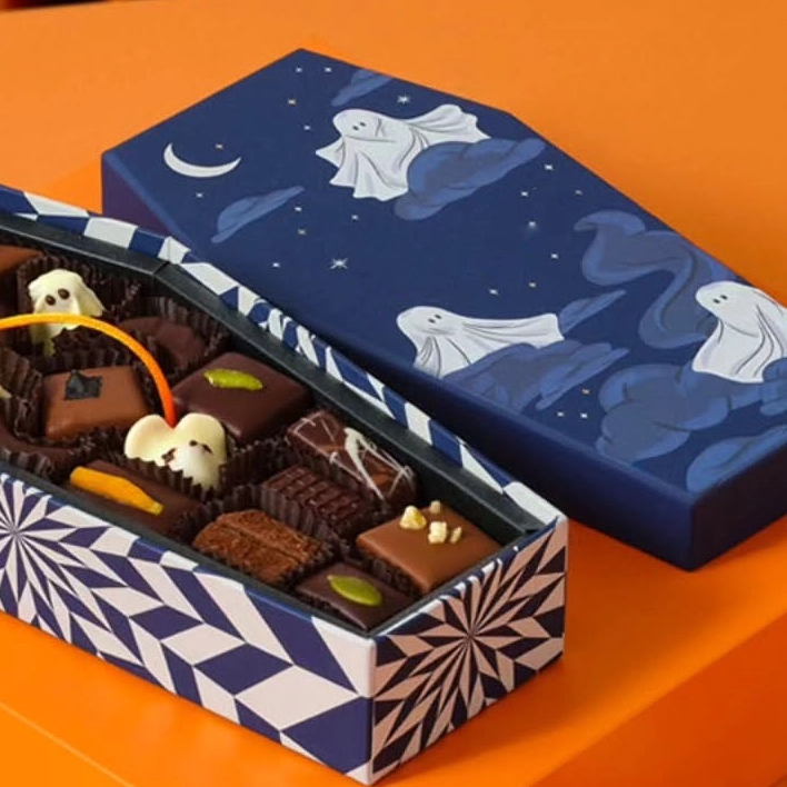 This coffin-shaped chocolate gift box is a whimsical, spooky-chic treat perfect for Halloween or playful gifting occasions. Crafted with a deep navy blue exterior, it features charming ghost illustrations against a starry night sky with crescent moons and wispy clouds, creating a magical, ethereal vibe.
