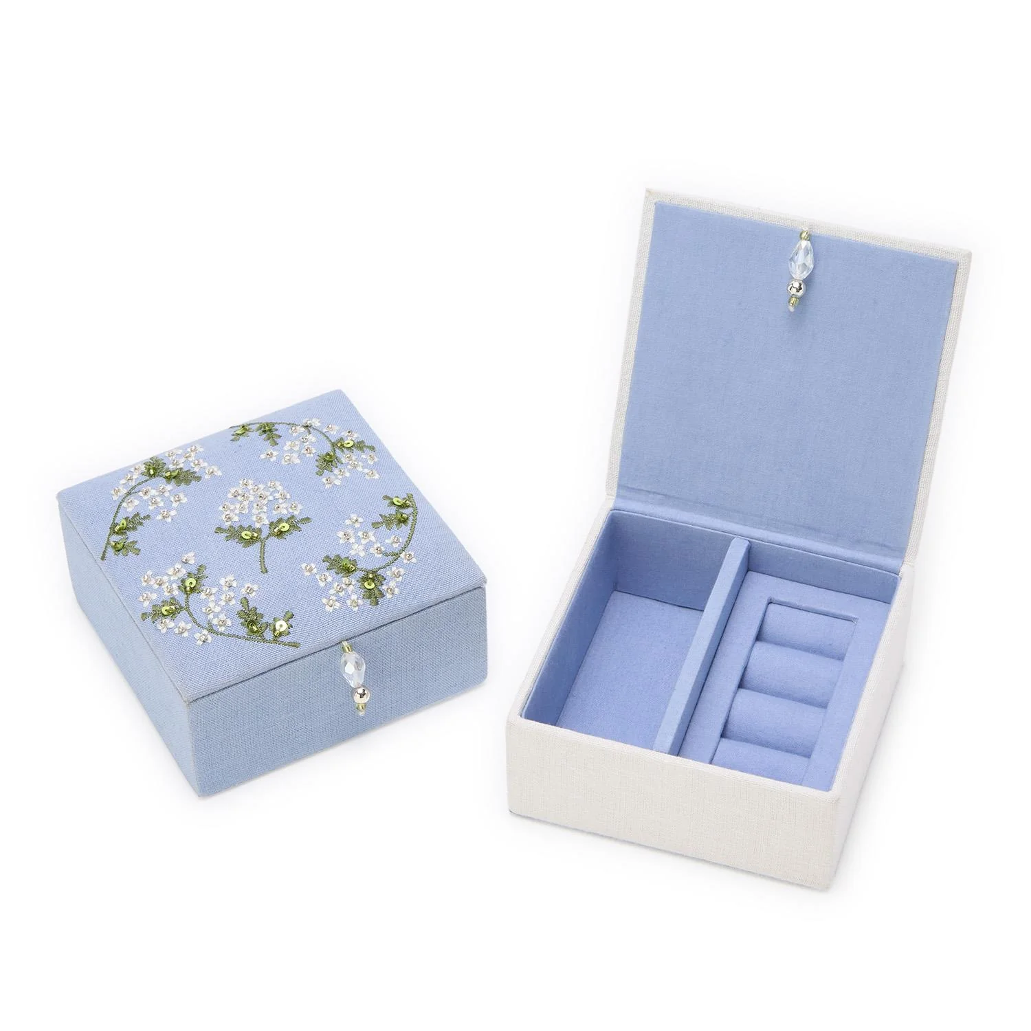 Store your favorite pieces in style with our Hydrangea Jewelry Box! Handcrafted with attention to detail, it features a charming beaded tassel and delicate hydrangea design. Made with MDF, cotton, beads, it's both elegant and functional. Available in blue or white. Perfect for any room.