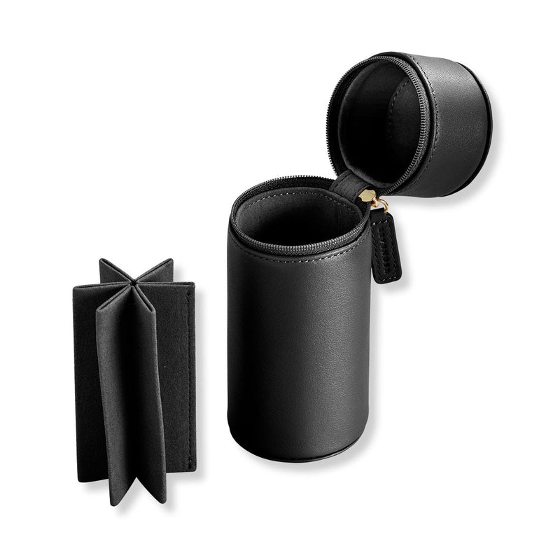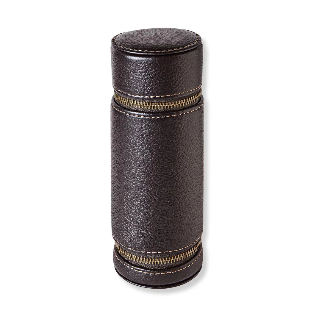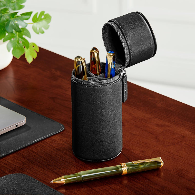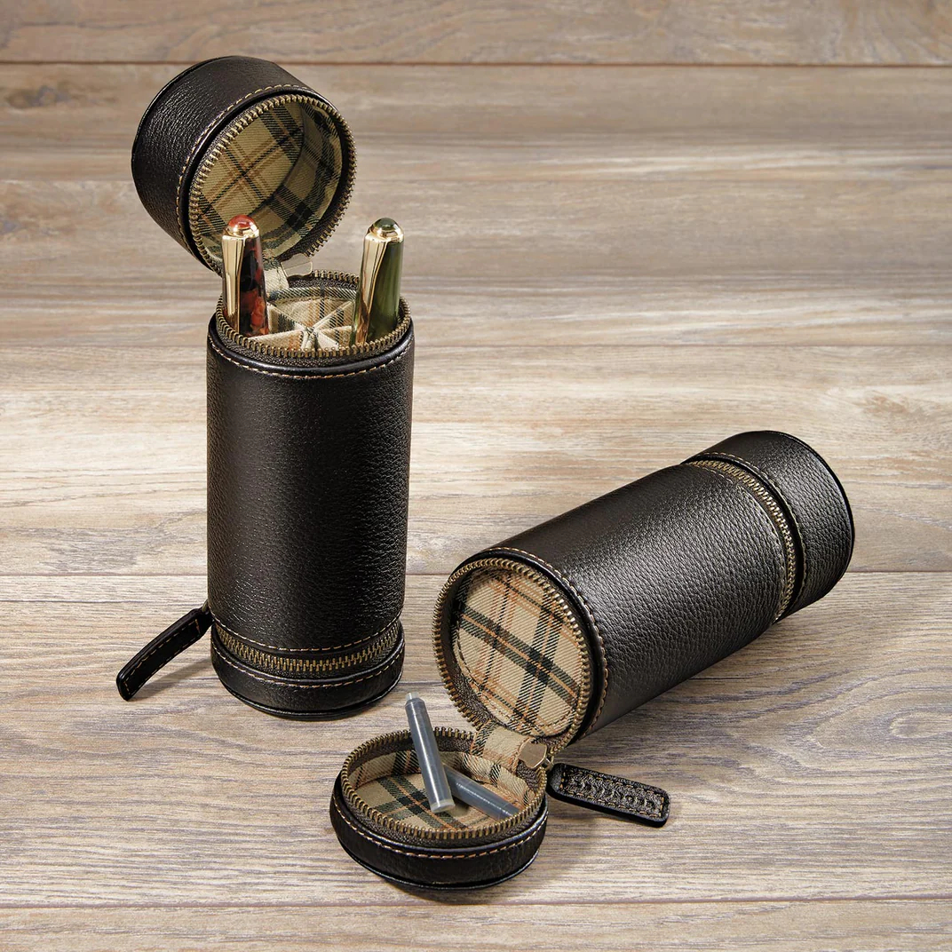 We've crafted this case from premium full-grain leather to store up to six of your favorite writing instruments. This clever cylindrical zippered pencil case is versatile and unique; it can be used as a travel case or as a desktop pen holder, standing upright on a table or desk when not in use.