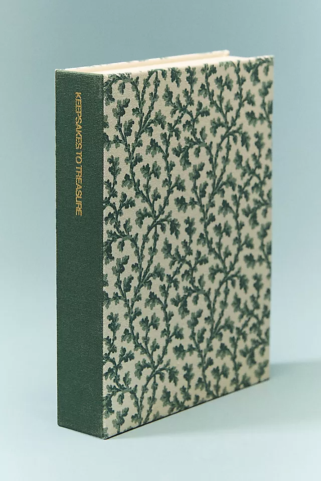 Exterior Design: The cover features a delicate green botanical pattern on an off-white fabric base, paired with a deep green spine embossed with the phrase "KEEPSAKES TO TREASURE" in gold lettering. It’s a beautiful decorative piece that disguises its function as a jewelry organizer.