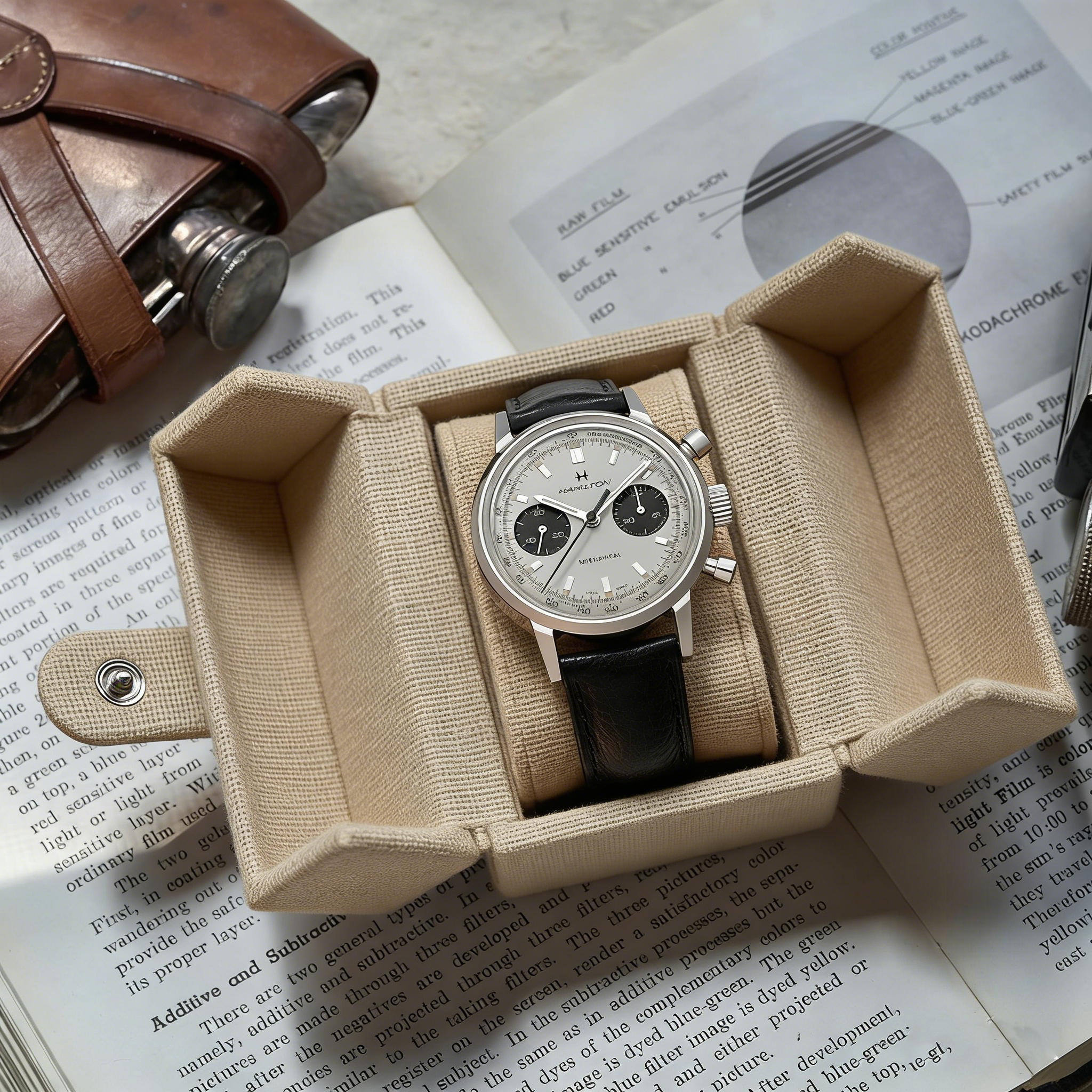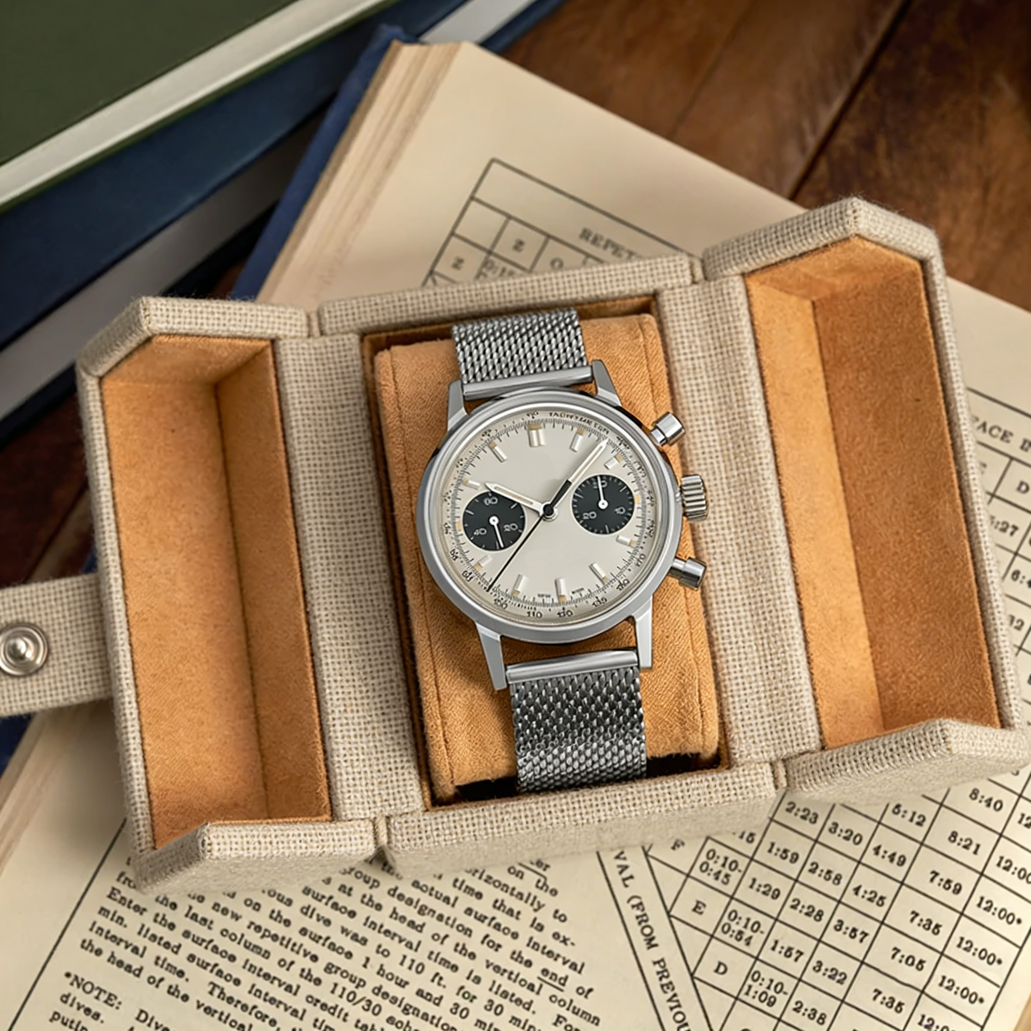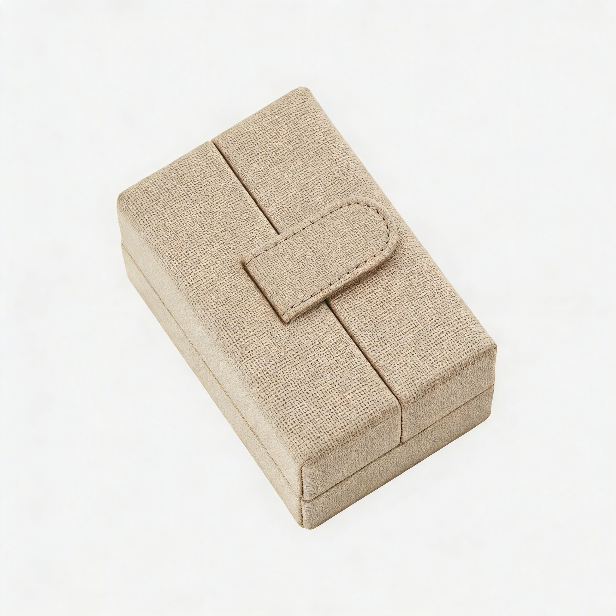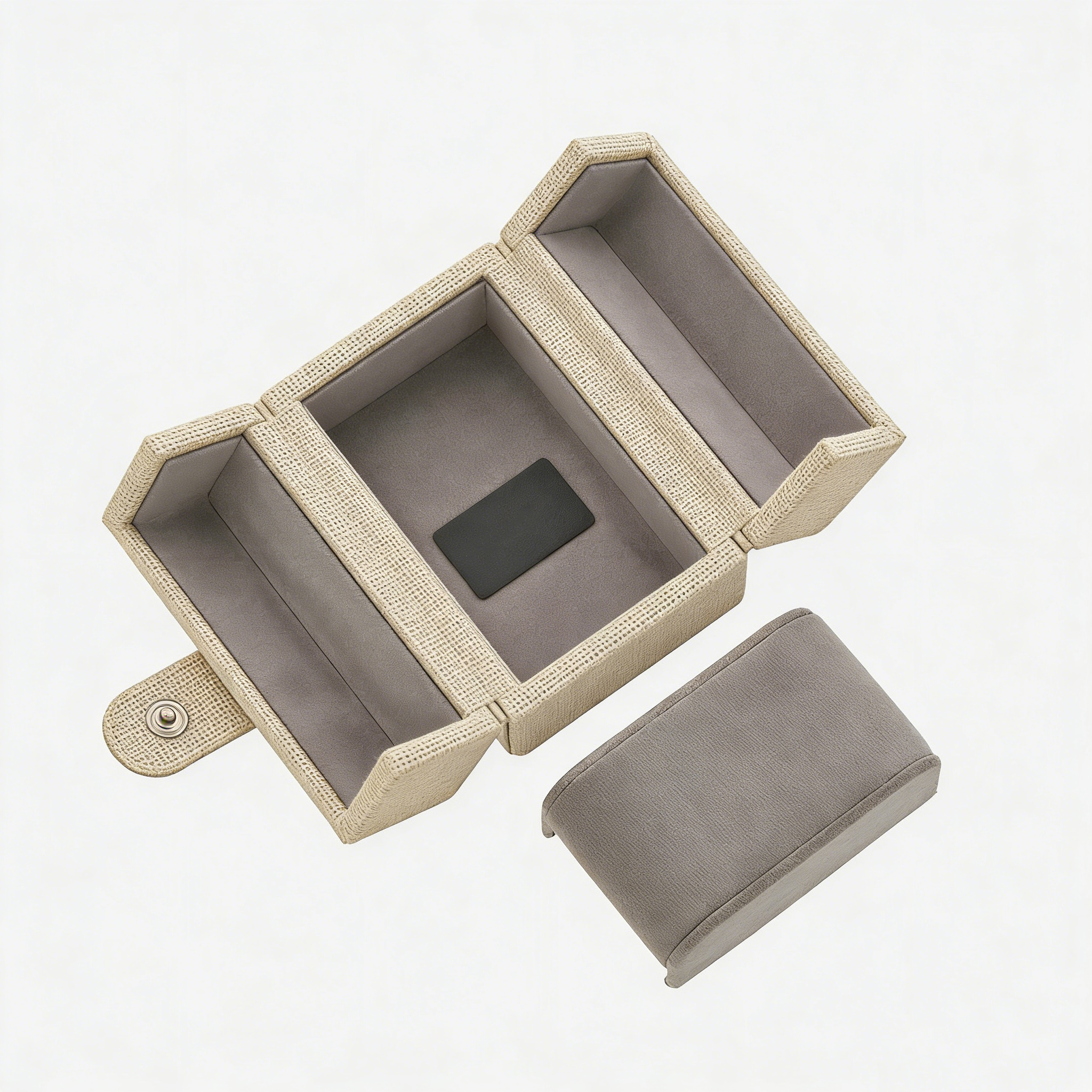 This double-opening watch box features a beige linen fabric exterior and a symmetrical double-opening design. The side lids can be flipped open, and the main storage area includes a detachable watch support with a curved design that perfectly conforms to the curvature of the watch strap, providing stable support for the watch.