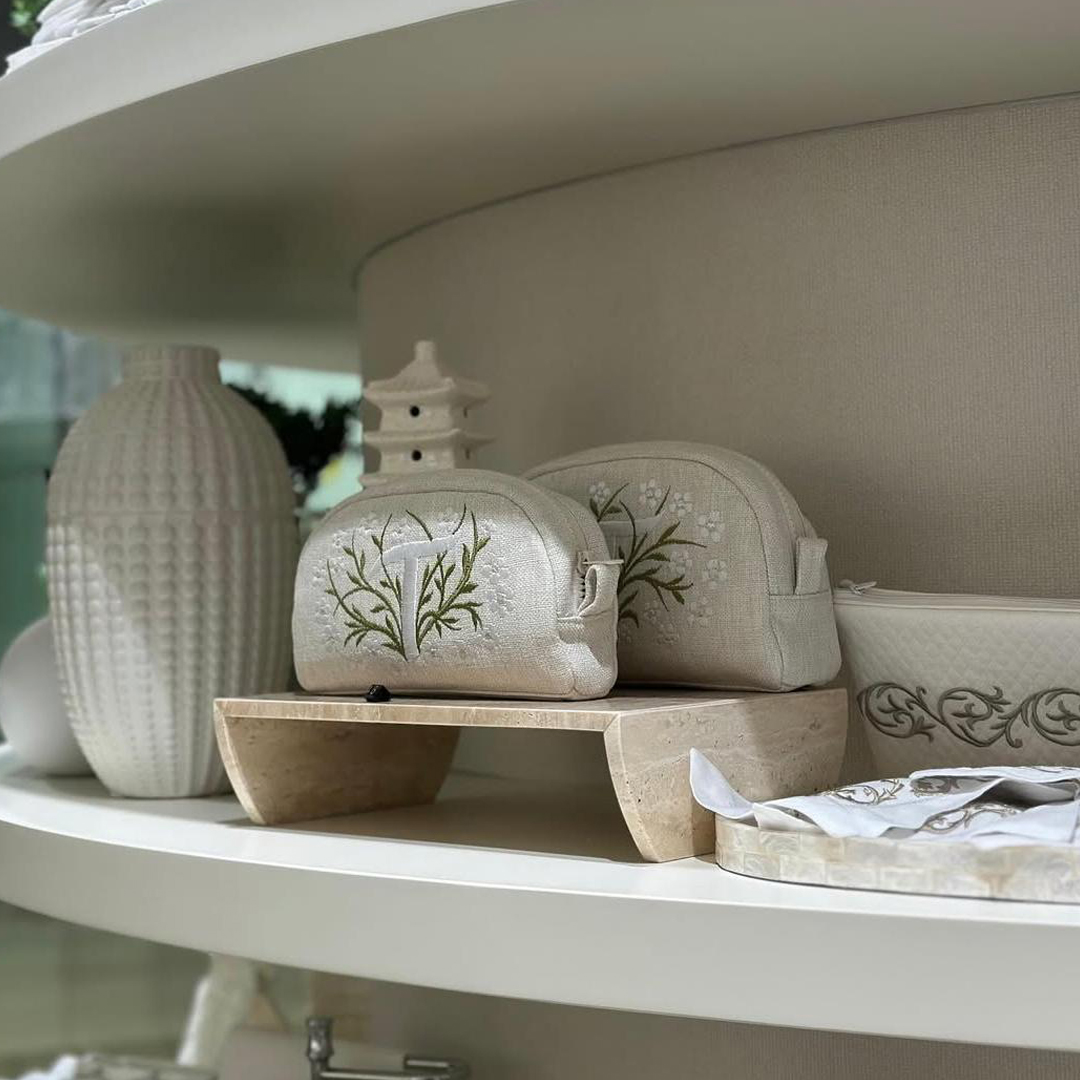 This exquisite handmade makeup bag is crafted from premium linen and adorned with beautiful hand embroidery in a variety of patterns, including floral motifs paired with a stylized "T" and striking palm leaf designs. The classic shell silhouette with a secure zipper makes it ideal for organizing cosmetics, accessories, or everyday essentials. Its versatile design easily serves as both a travel companion and a vanity organizer, while the neutral linen tone ensures it blends seamlessly with any style.