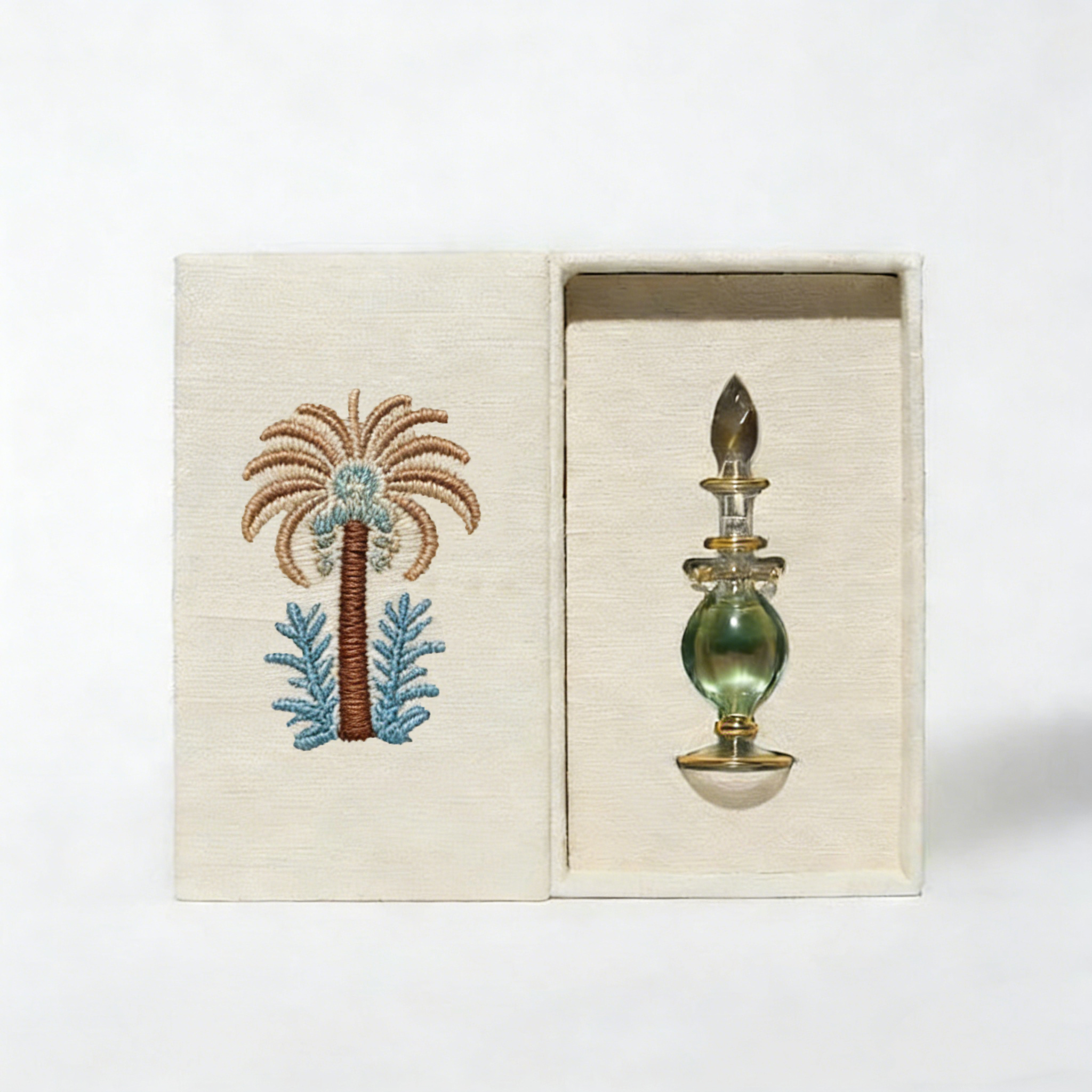This embroidered perfume bottle gift box is wrapped in soft, matte linen.