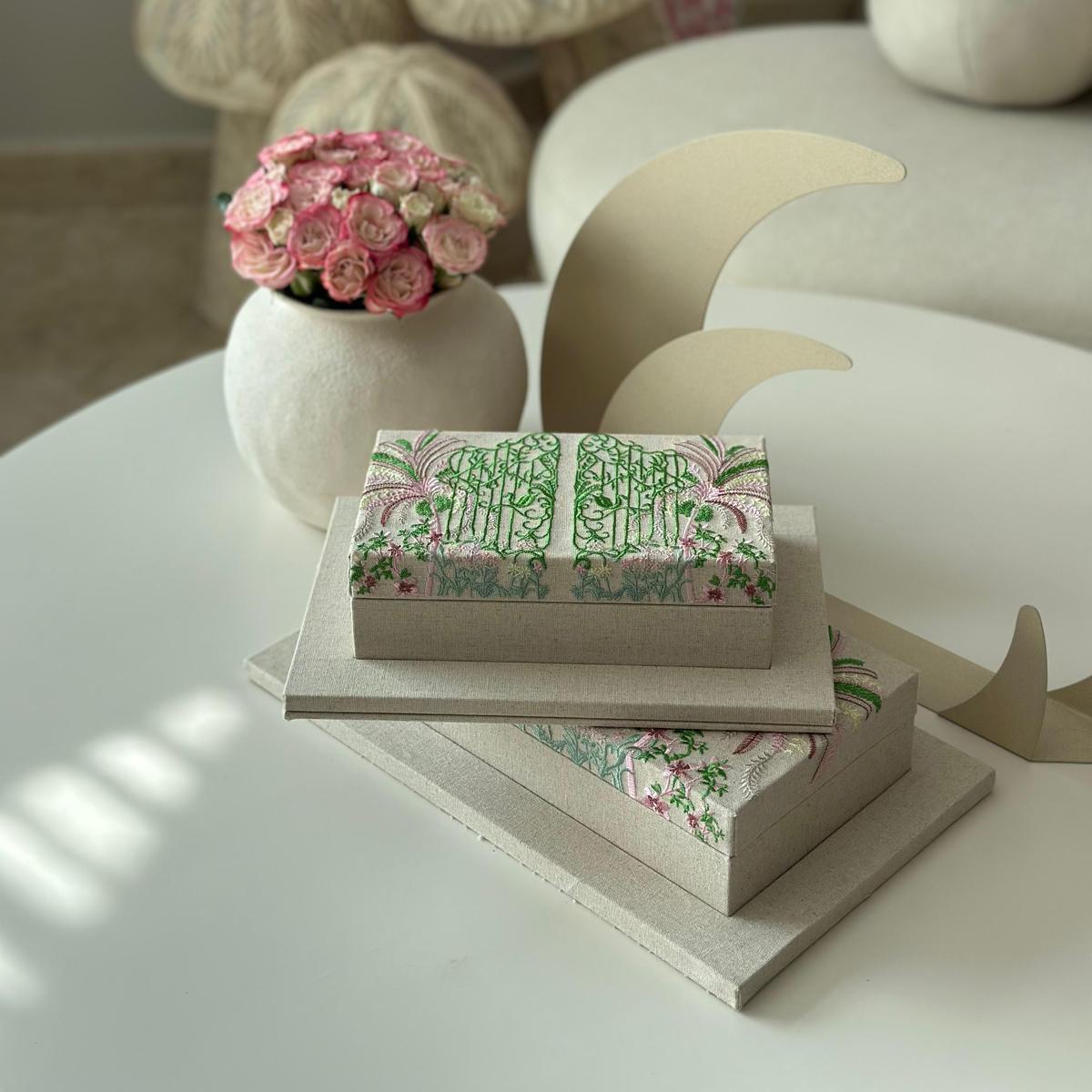 Description: This gift box is made of beige linen blend fabric, lined with sturdy cardboard or wood. The box is decorated with a three-dimensional embroidered vine pattern in gradient green thread, adorned with pink and white flowers and delicate leaves, giving the design a sense of line and subtle three-dimensionality. The gift box features a double-lid design and can be stacked with the matching base, enhancing its overall aesthetic and effectively protecting it from dust.