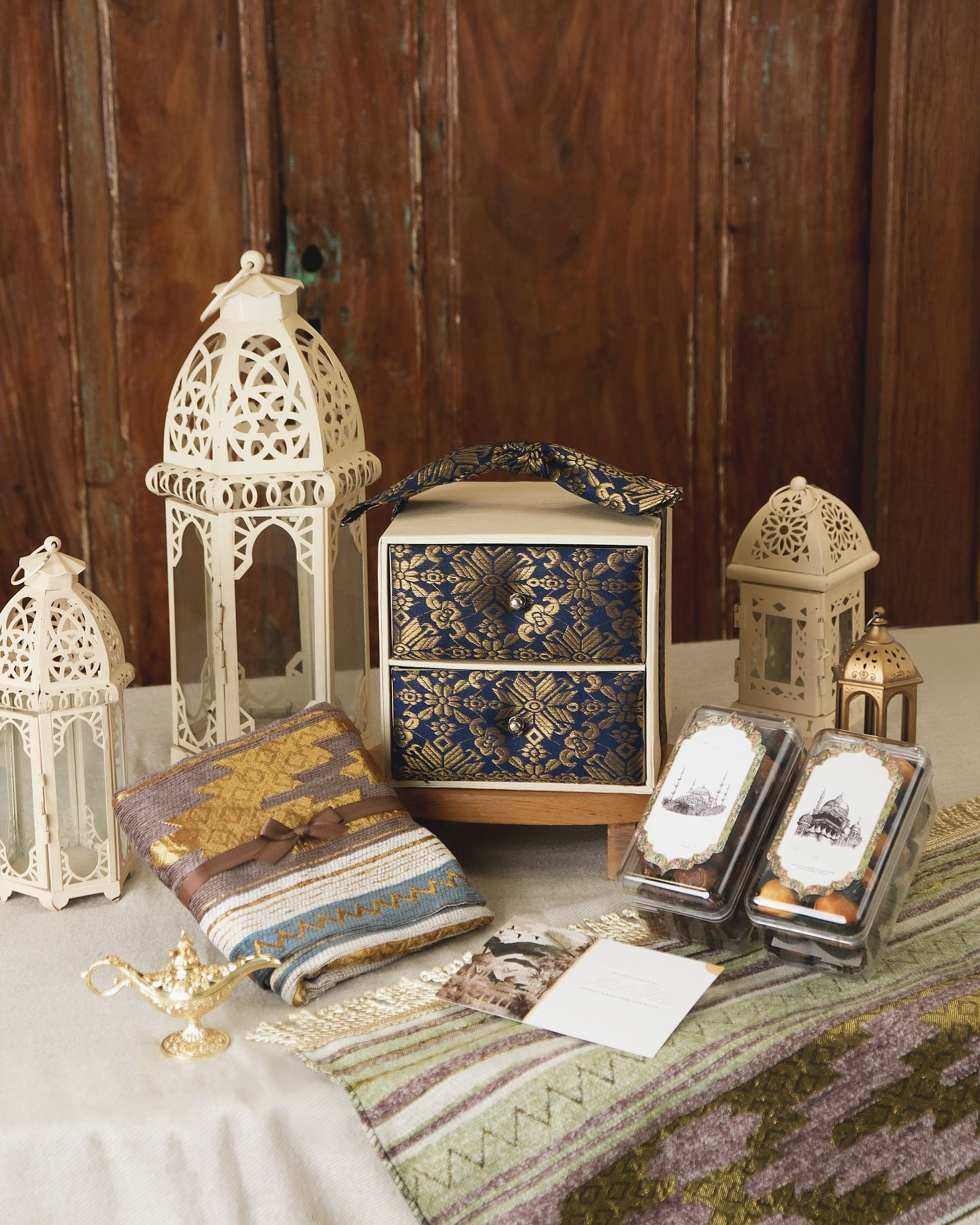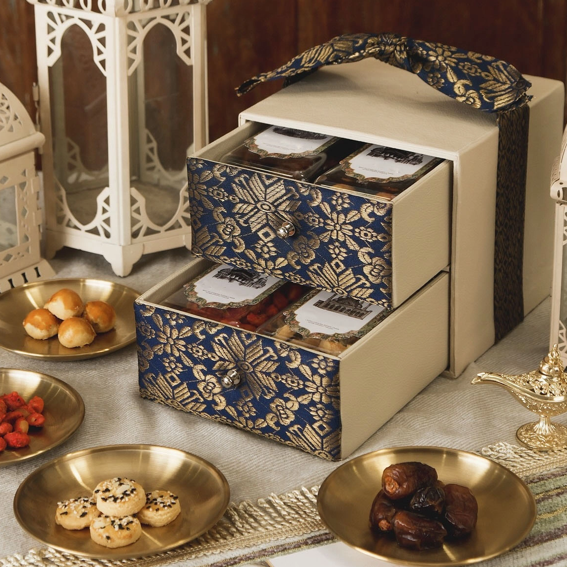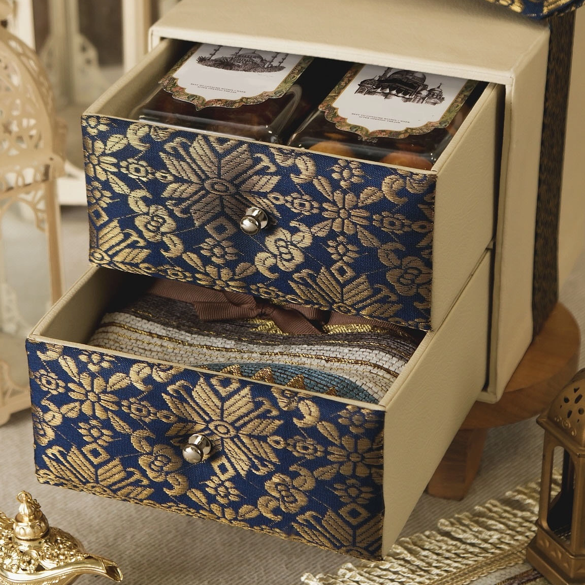 Design & Material: The box features a sophisticated cream-colored base paired with rich teal songket-style woven fabric, adorned with intricate gold geometric and floral motifs. It comes with a matching fabric ribbon bow and a delicate floral tag, adding a touch of luxury and refinement. Structure: It has two smooth drawers with small silver knobs, offering practical storage space for small treasures, treats, or personal items.