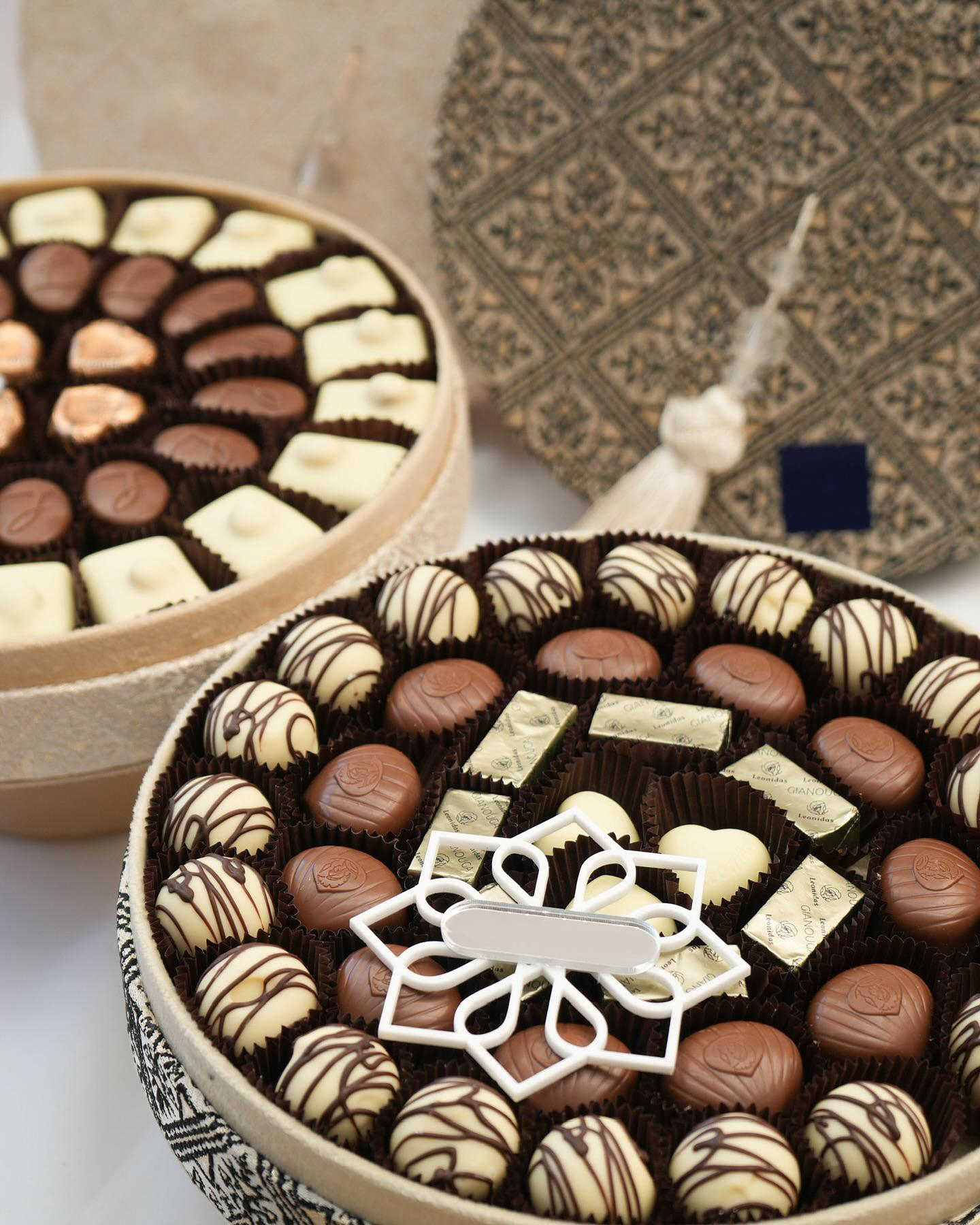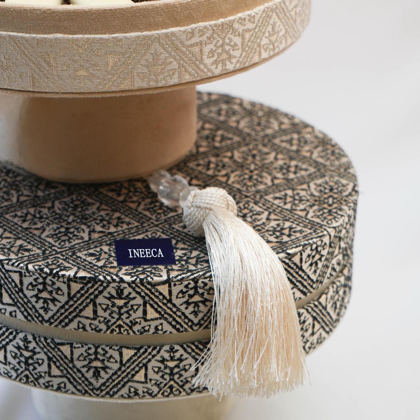 This chocolate box is crafted from exquisite brocade fabric and offers two elegant designs: a soft beige base with understated gold accents, and a classic black and white geometric pattern. The brocade's exquisite weaving showcases timeless textile artistry, offering a luxurious feel and appearance. Handmade silk tassels adorn the box, adding to its refined elegance and tactile charm. A perfect gift for Ramadan, Christmas, and weddings.