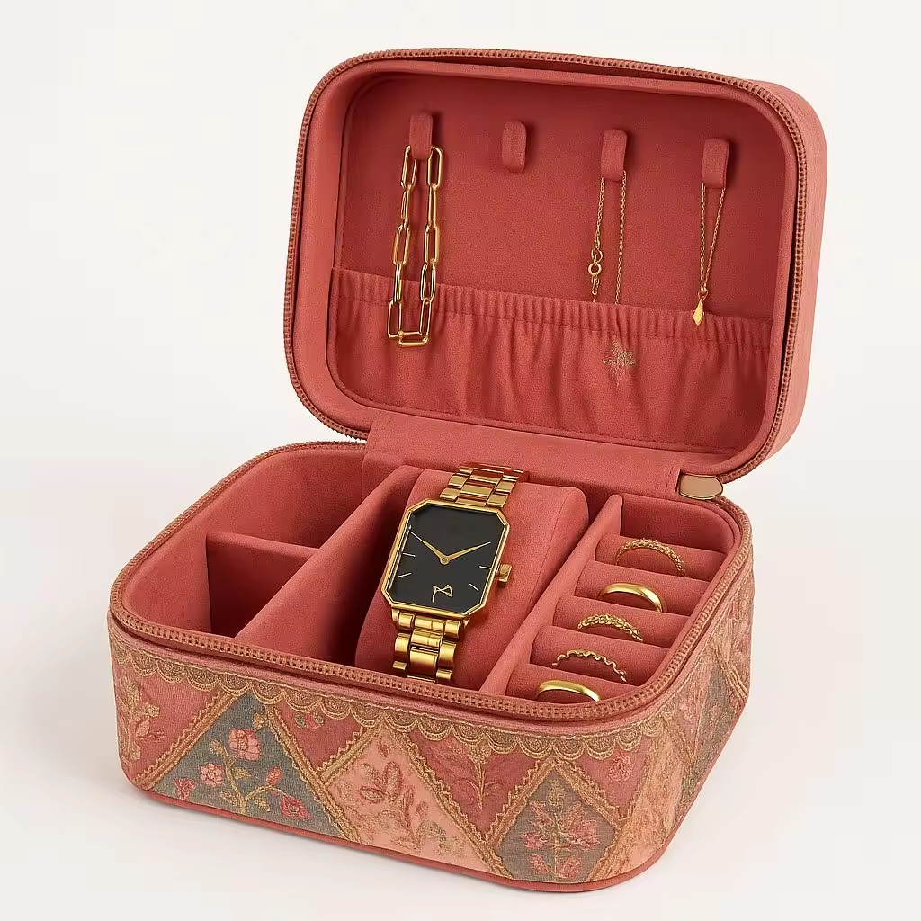 Stay stylishly organized with this charming fabric jewelry box. Crafted from natural cotton, it features delicate embroidery and beaded details, a zipper to keep gems safe, and elastic pockets, ring slots and compartments to keep everything organized.