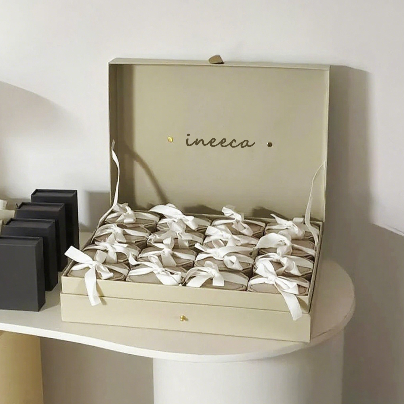 These gift boxes feature a minimalist pattern and a stylish leather handle for easy carrying. They snap shut for secure storage. Each large box contains 16 neatly arranged smaller boxes, each tied with a delicate white ribbon for a touch of romance. They're perfect for storing jewelry, candy, or small surprises. Whether it's a wedding, birthday, Christmas, Ramadan, or a quiet self-care ritual, these gift boxes will add a touch of sophistication to any occasion. Let these gift boxes transform ordinary gestures into unforgettable memories.