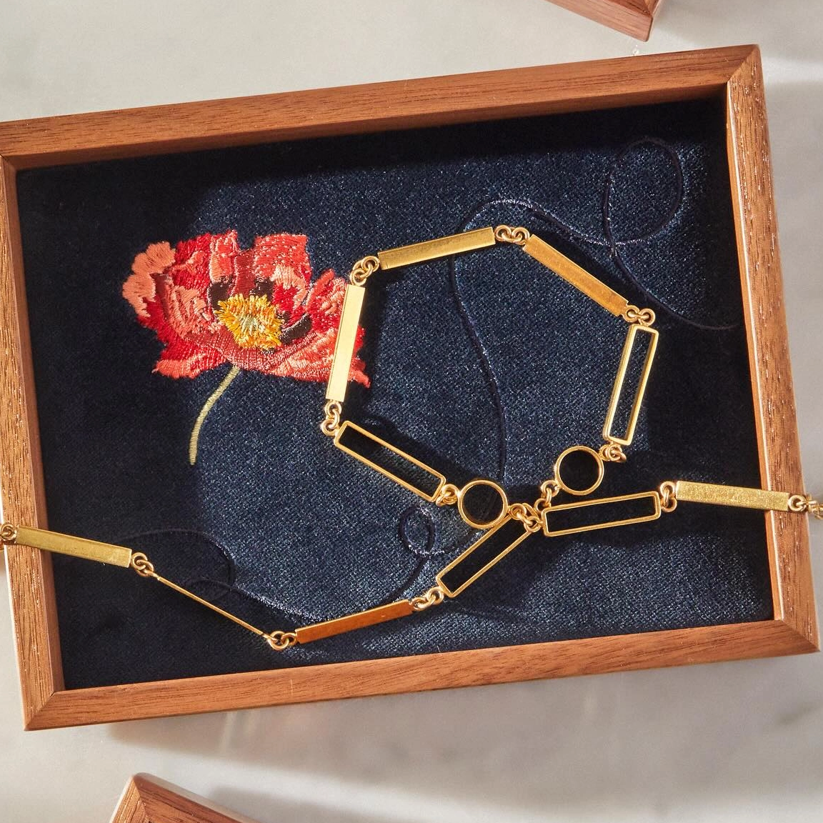 Use Contrasting Colors - Embroidered Floral Motif trays make diamonds and gold pop, while white trays enhance colorfulgems.