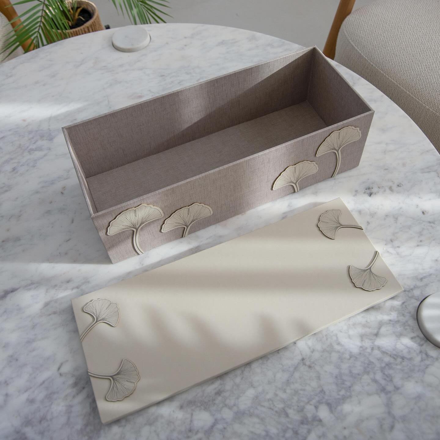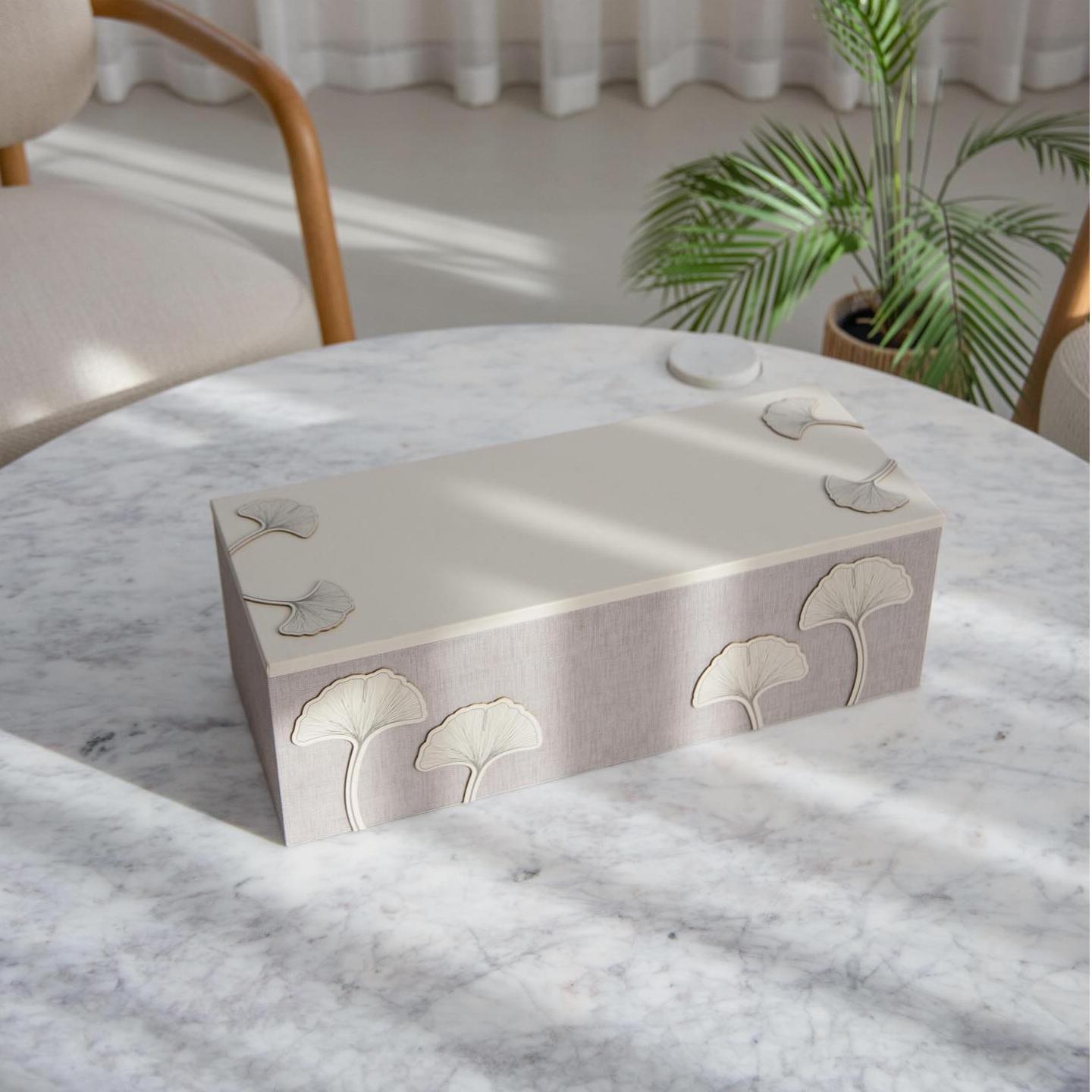 This storage gift box features a ginkgo leaf design, blending natural beauty with practical functionality. The outer box is crafted from a light linen texture, and the 3D ginkgo leaf embellishment adds an artistic touch. Inside, it can hold three jars with ginkgo leaf lids, a tray, and a small spoon. It's perfect for storing snacks, jams, and more. The tray neatly arranges the box, making it perfect for desktop storage or holiday display, adding a touch of style to your home or gift.