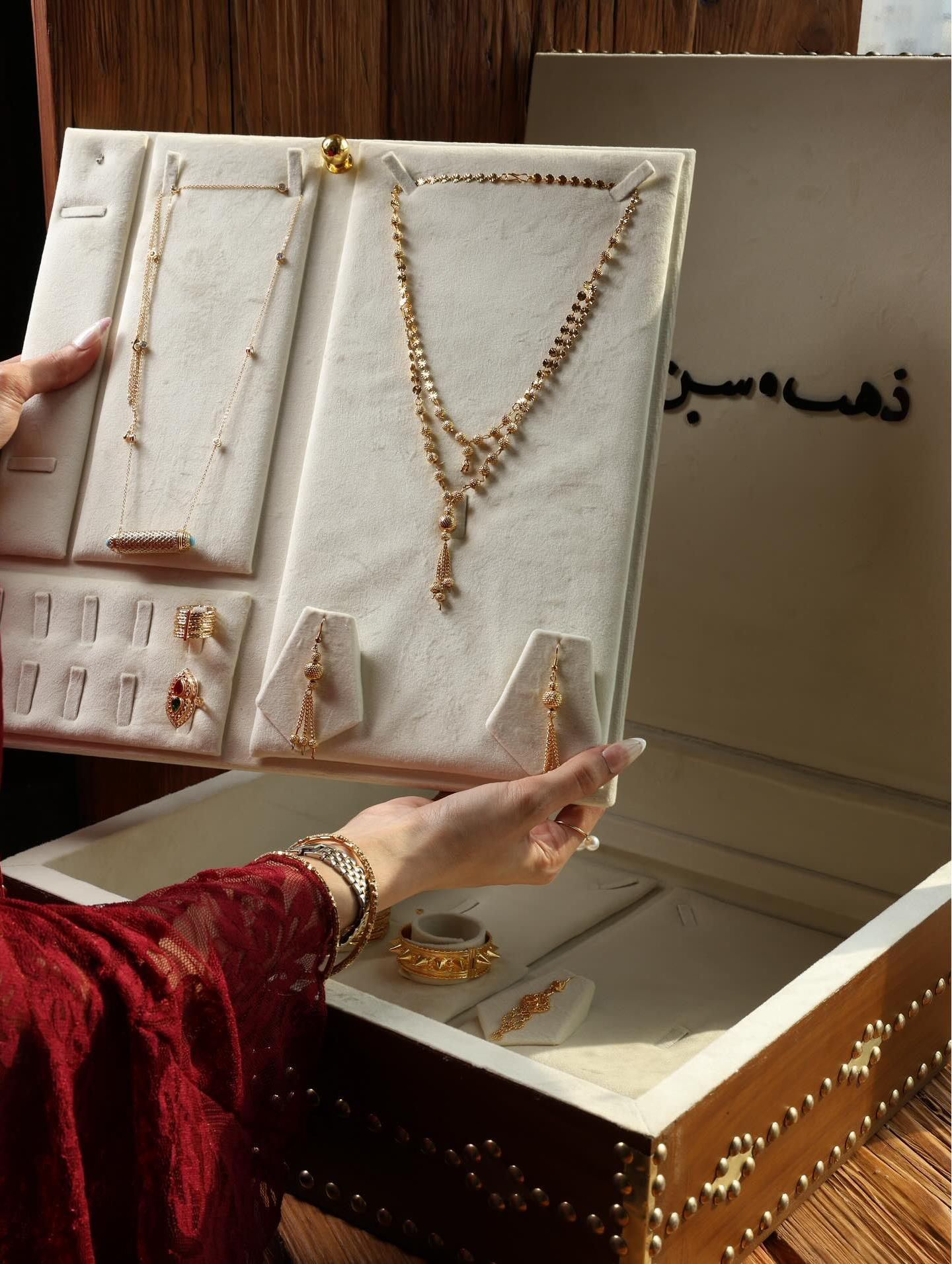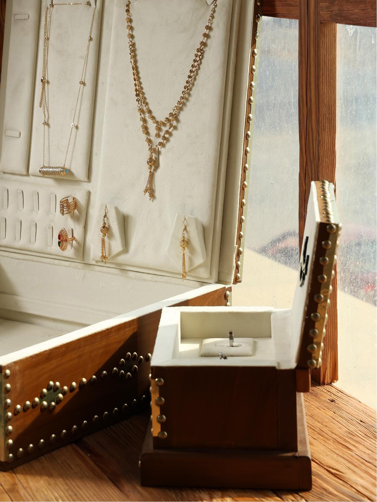 This jewelry box is crafted from wood and embellished with metal rivets, creating a rich, vintage and luxurious feel. The box is lined with soft, delicate off-white velvet, providing intimate protection for your jewelry.