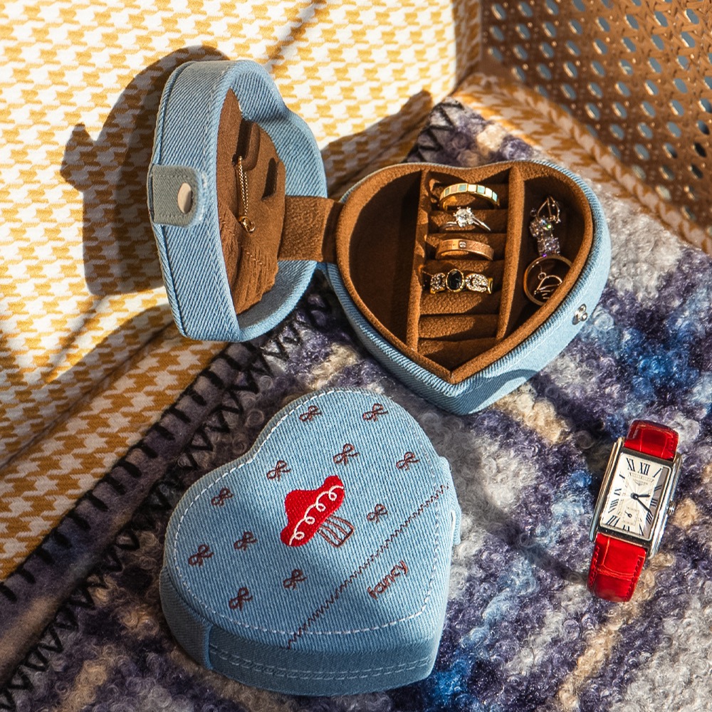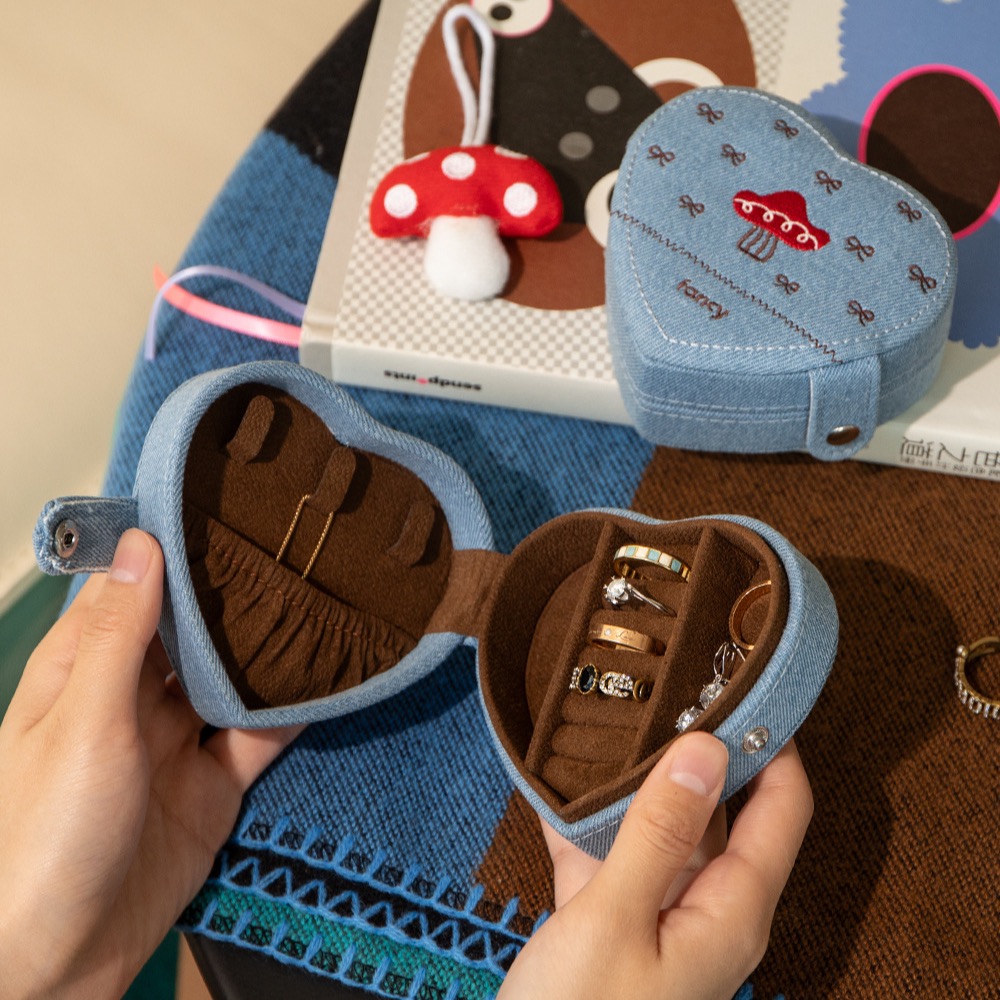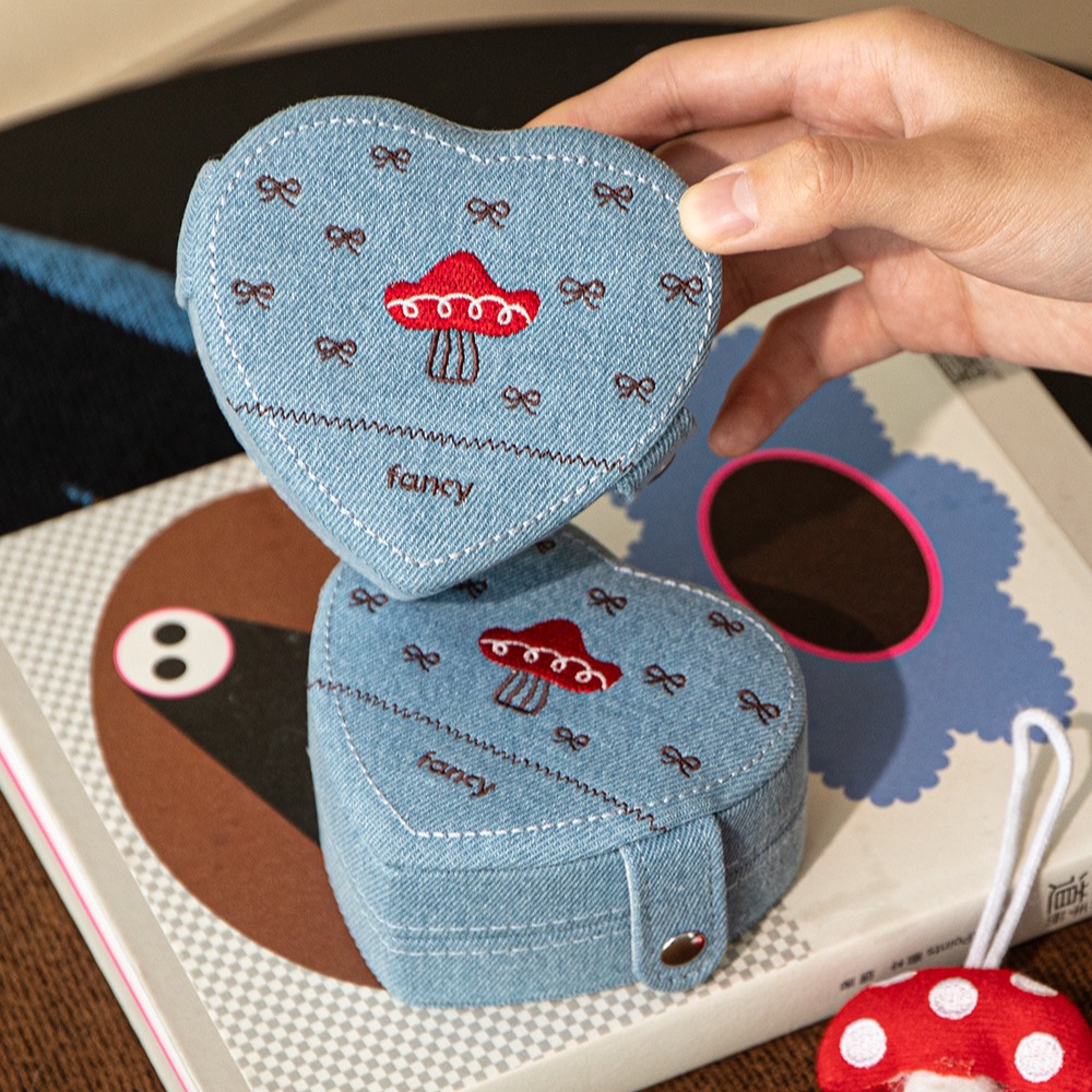 This heart - shaped jewelry box features a denim exterior with cute mushroom embroidery. The interior is lined with soft velvet, providing a safe space for rings, necklaces, and small jewelry. It's compact, portable, great for travel or daily storage, and adds a touch of whimsy to your jewelry organization.