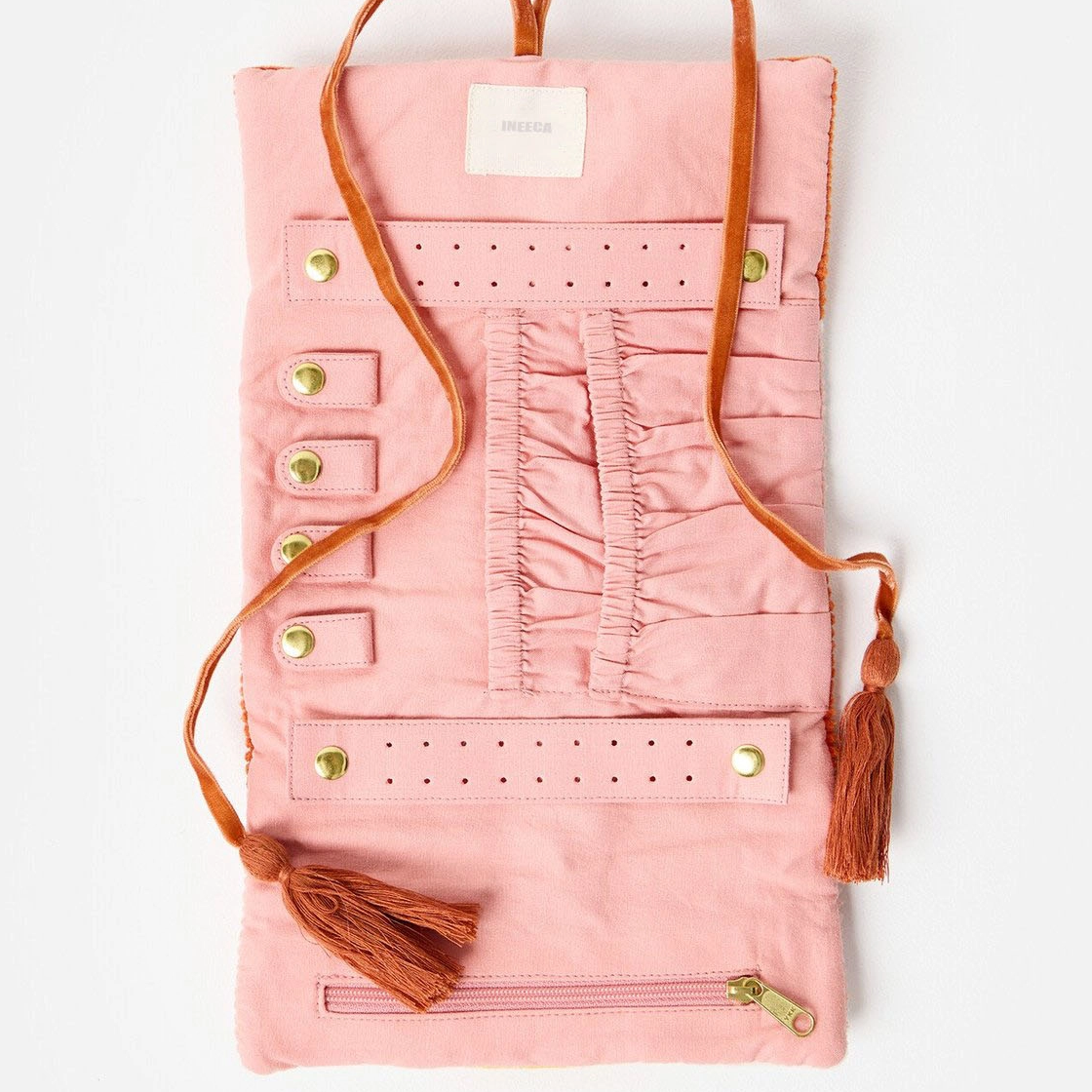 to secure and fasten the roll. The inside has two removable earring strips, four necklace hooks, a zipped pouch and two