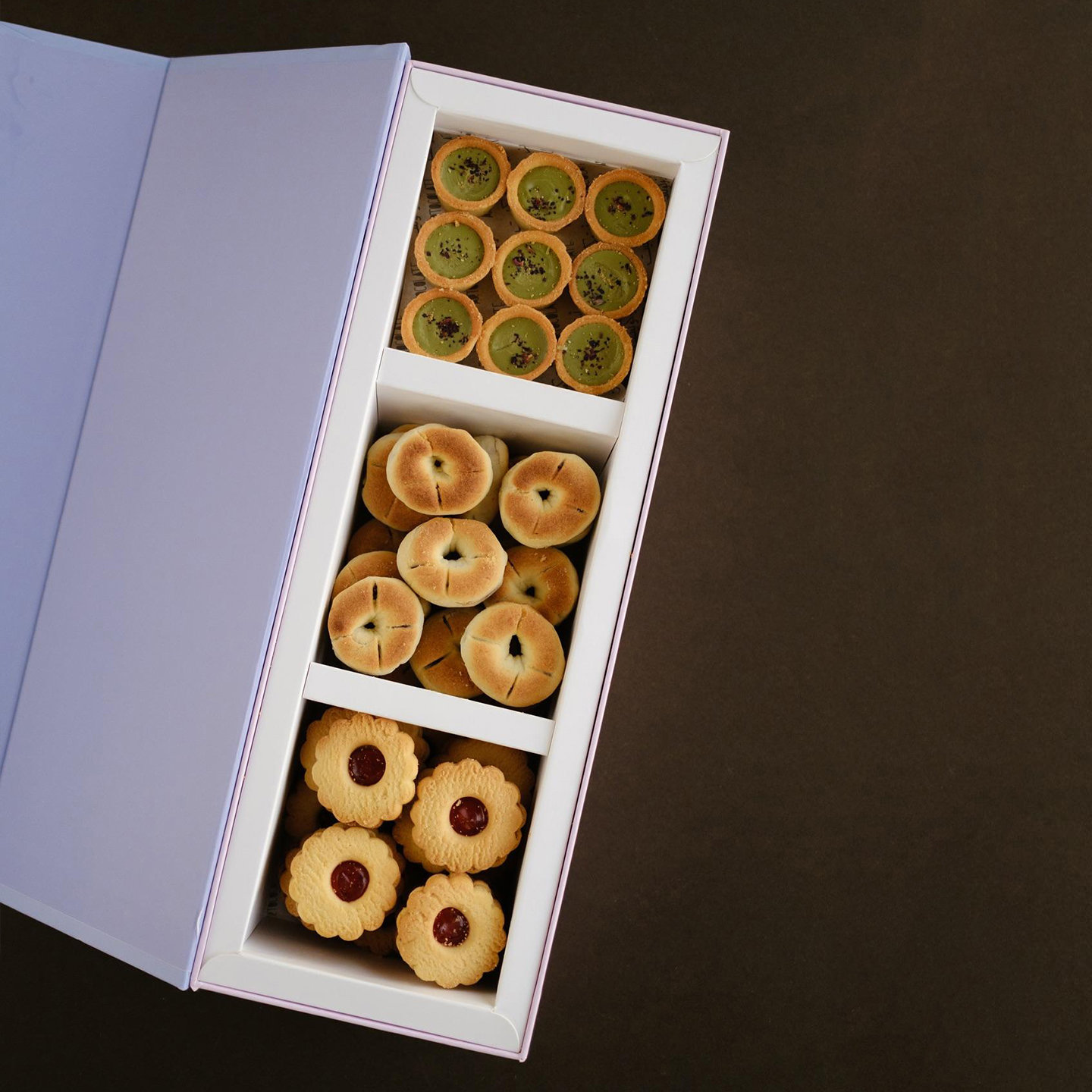 It has a multi-tiered design with an internal tray and dividers for neatly holding sliced pastries, cookies, and other desserts.