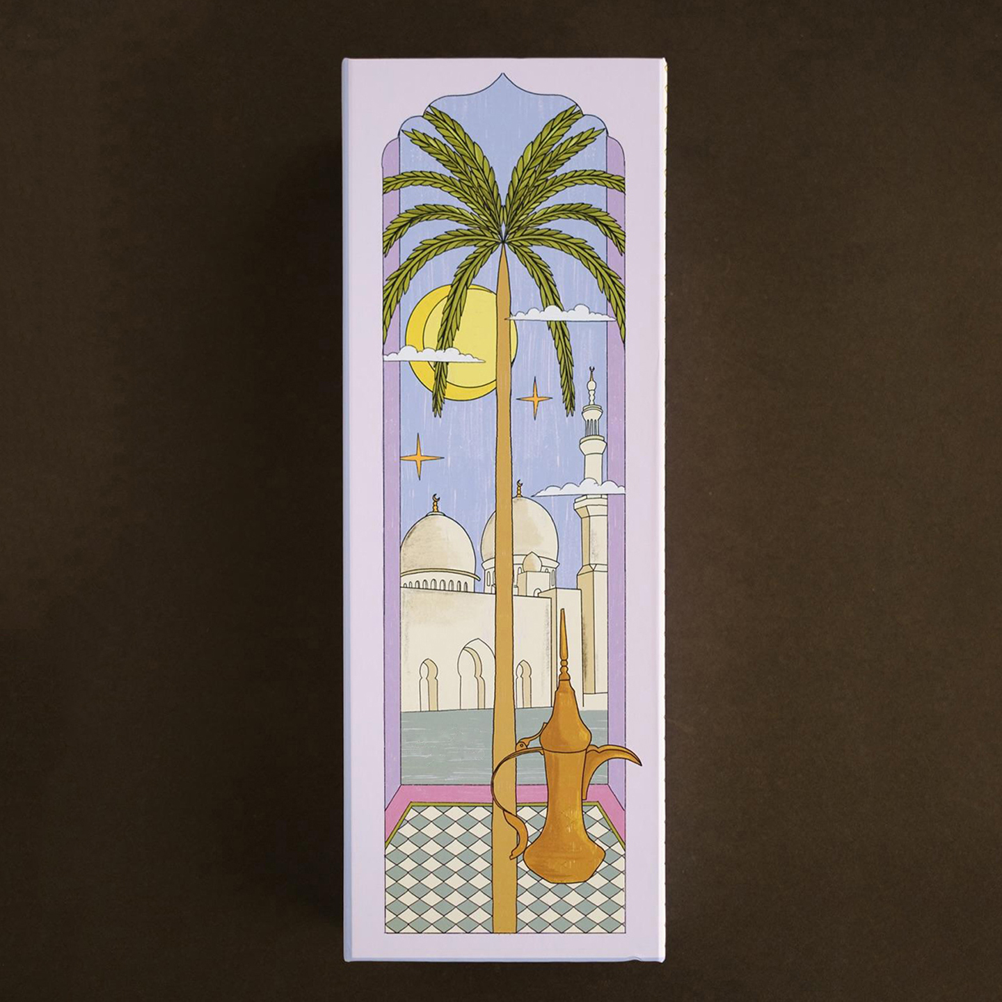The gift box features a palm tree pattern with Islamic-style geometric checkered edges.