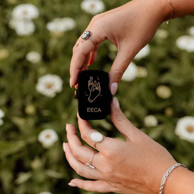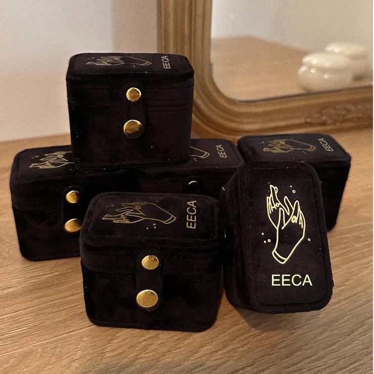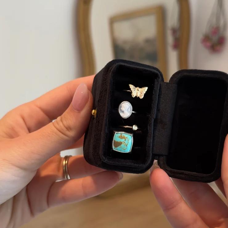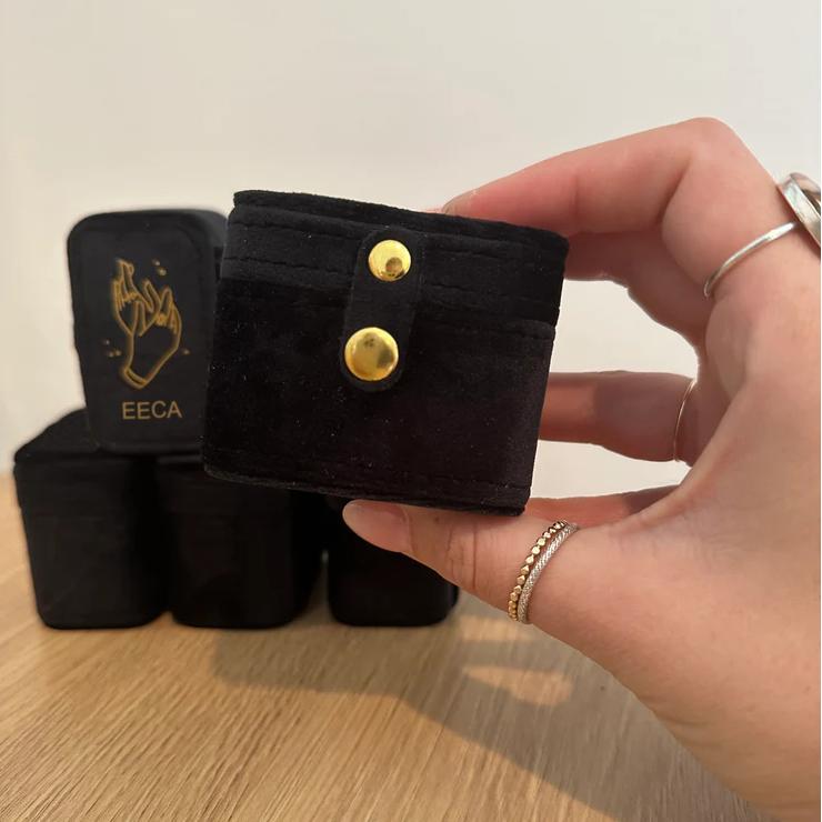 These jewelry boxes are made for jewelry lovers in custom color/style combinations. Sleek black velvet boxes are embellished with luxurious gold foil jewelry logos. Custom gold snaps keep your jewelry safe and sound - perfect for up to 5 jewelry rings.