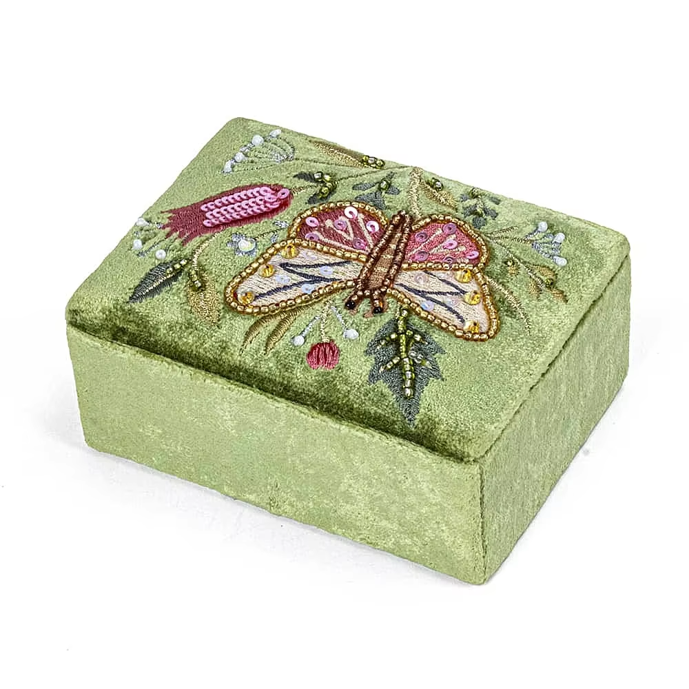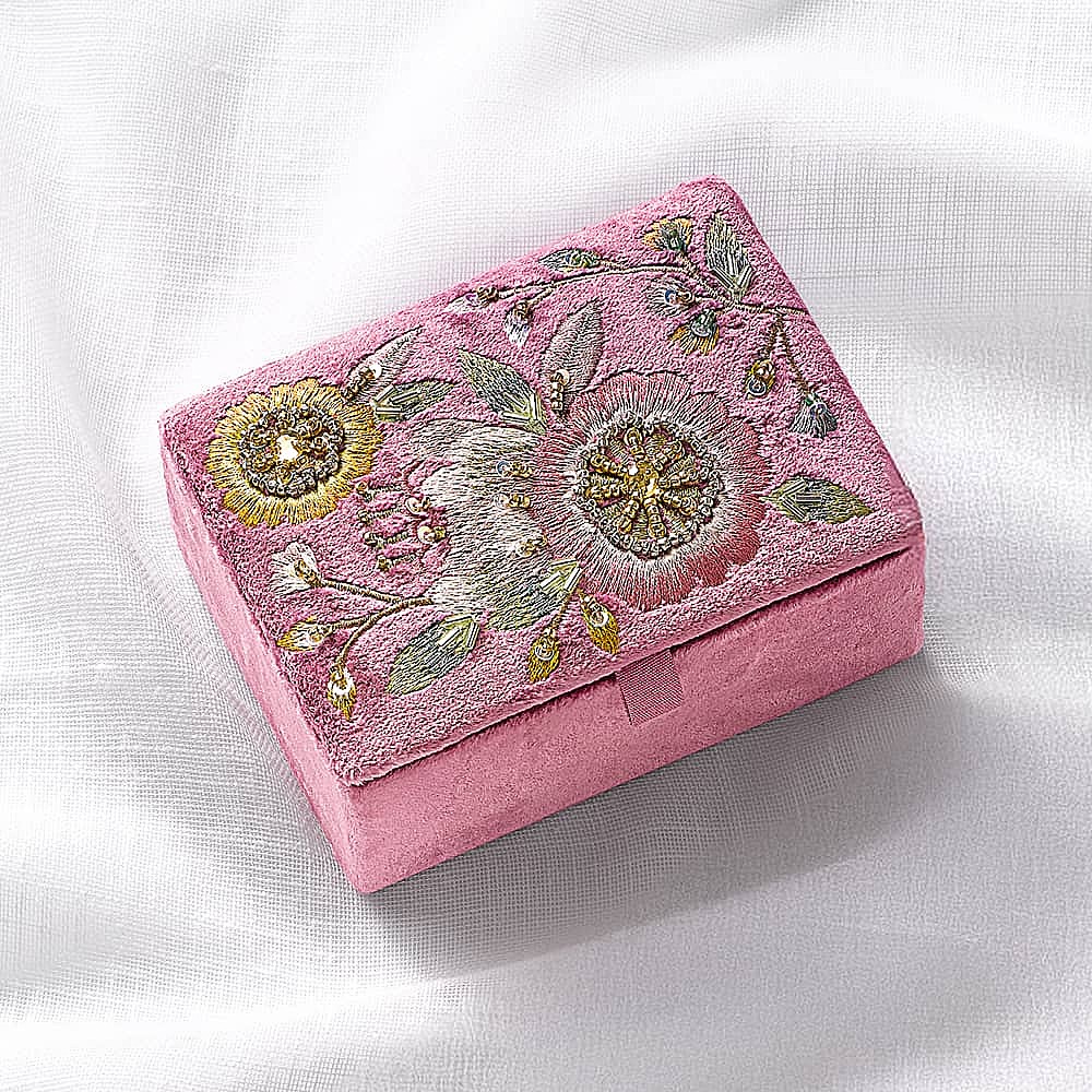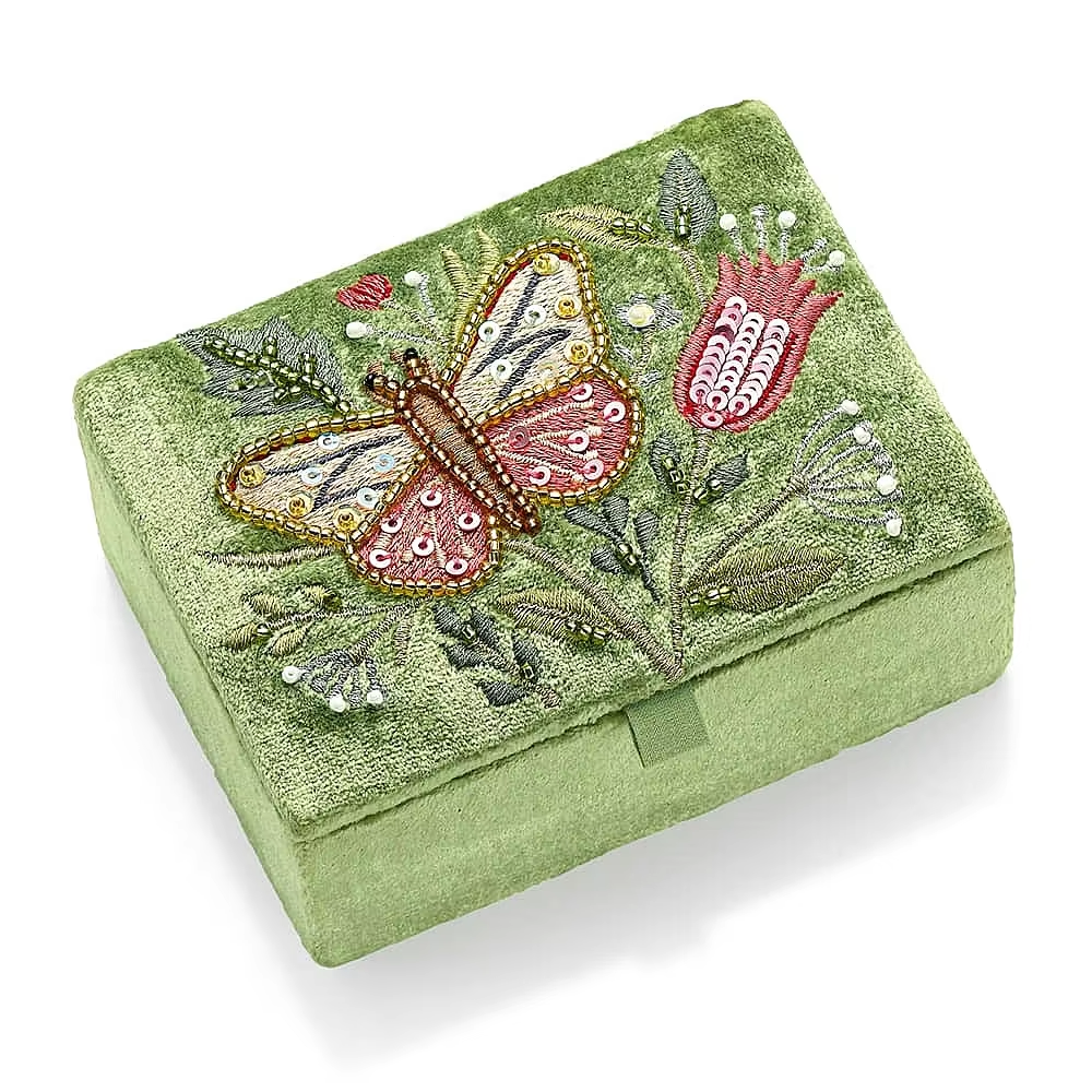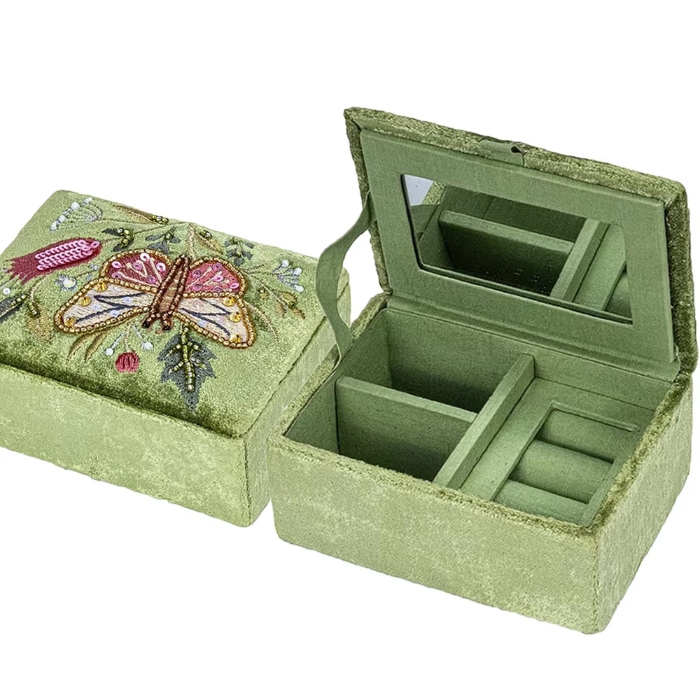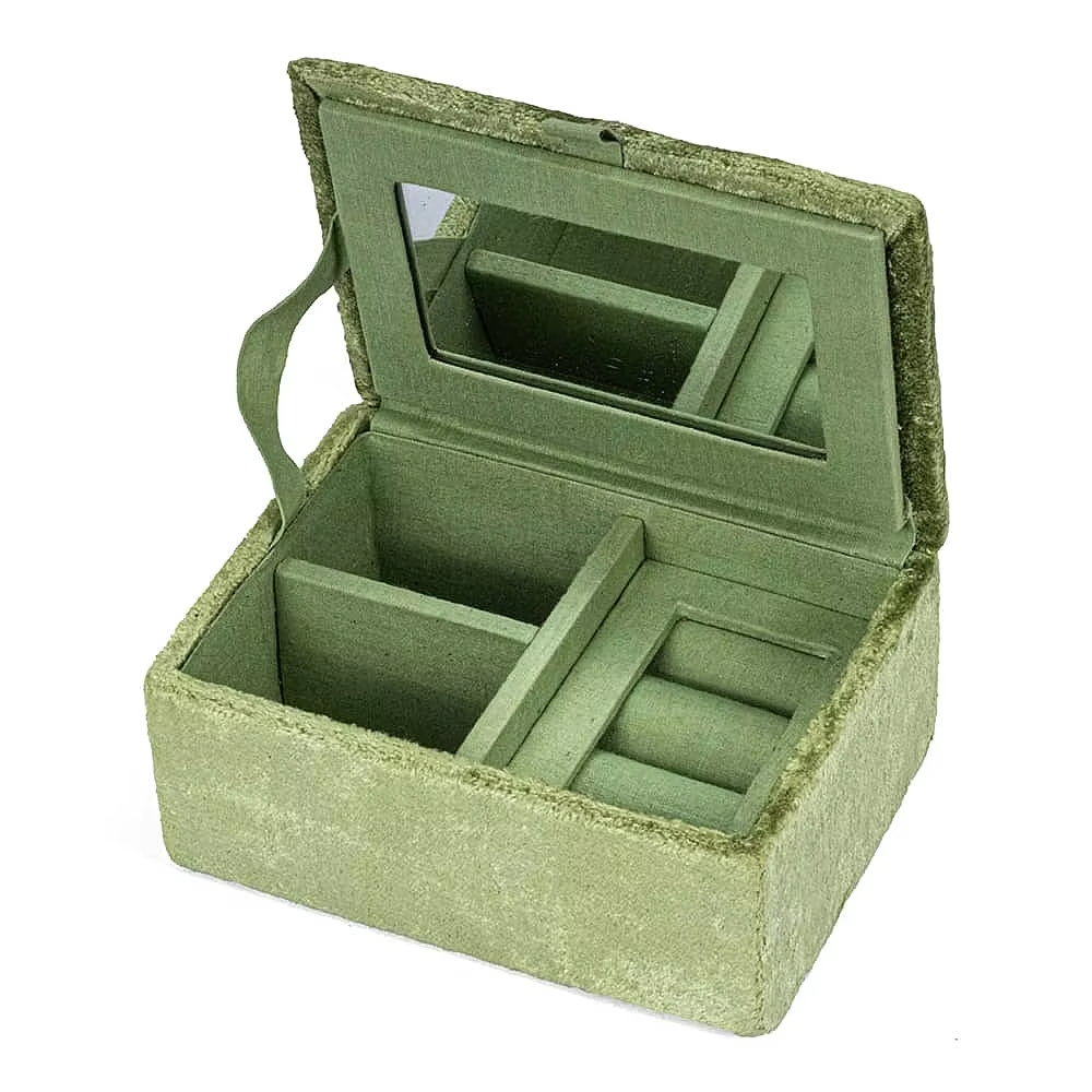 Express your personal style with this beautiful storage solution. Crafted from green velvet and embroidered with a delicate floral pattern, this elegant jewelry box will not only keep your treasures safe, but will also enhance the style of your dressing table or vanity. With two compartments, two ring slots and a mirror inside the lid, the box is practical and ensures your jewelry is organized and easy to access. It is undoubtedly the perfect gift for those who value the little things in life.
