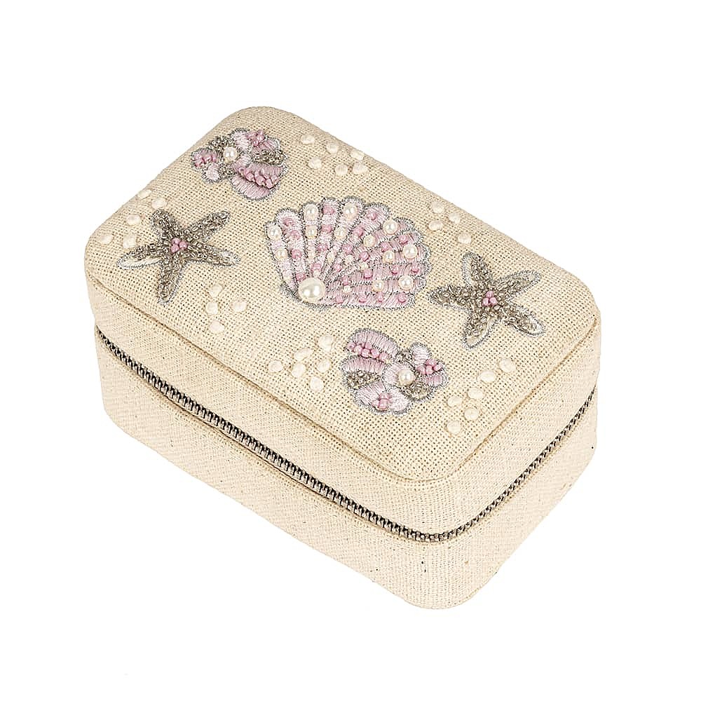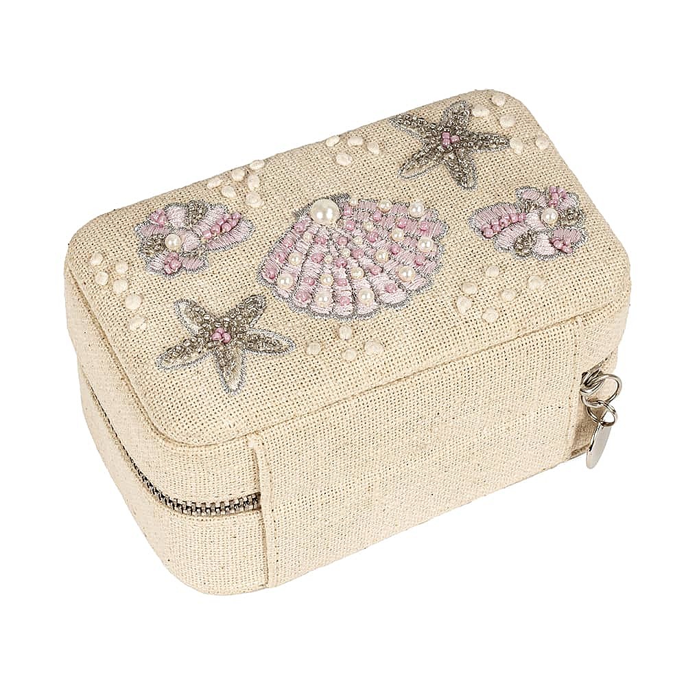 Stay stylishly organized with this charming fabric jewelry box. Crafted from natural cotton, it features delicate embroidery and beaded details, a zipper to keep gems safe, and elastic pockets, ring slots and compartments to keep everything organized.