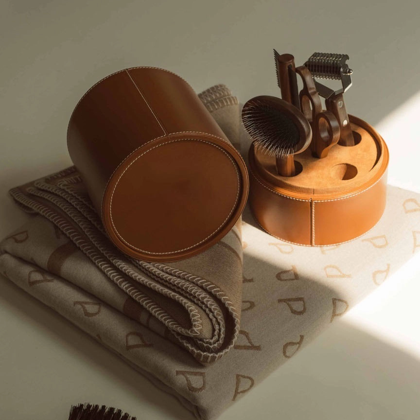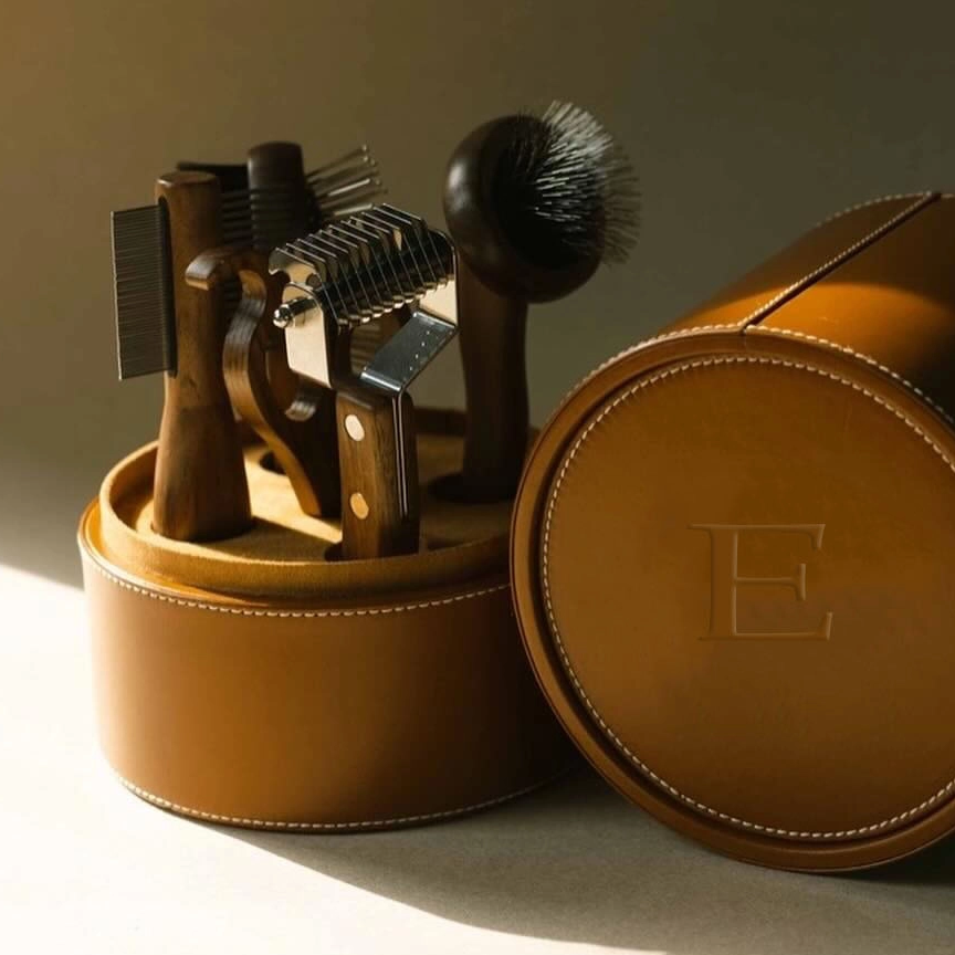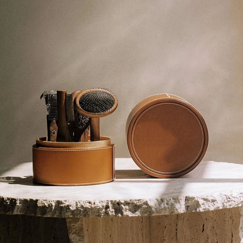 Luxury Pet Grooming Tool Set with Leather Cylindrical Case Elevate your pet care routine with this sophisticated, artisanal grooming set, designed for discerning pet parents who value both style and functionality.
