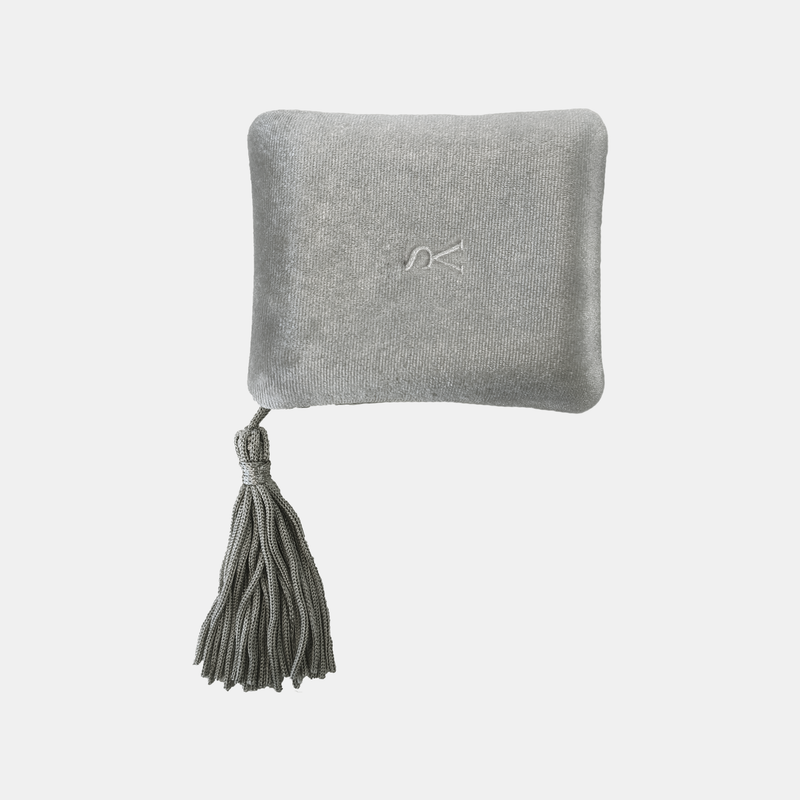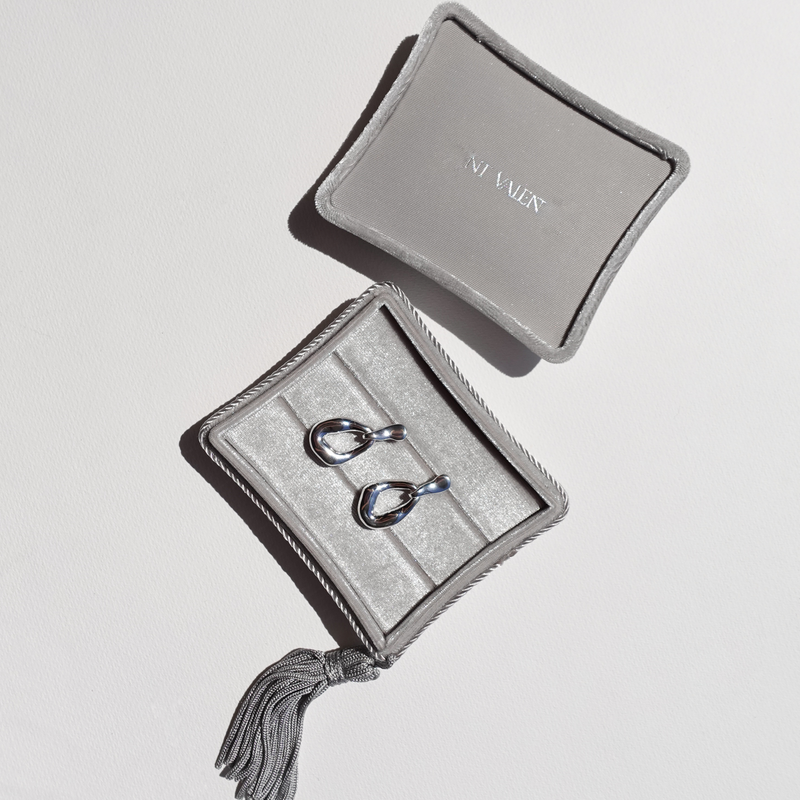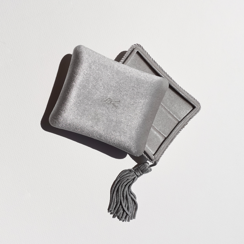Introducing our signature brand velvet jewelry box, available in grey and pistachio green. The perfect place to store your precious jewelry, displayed on your dressing table at home or stored safely while traveling.