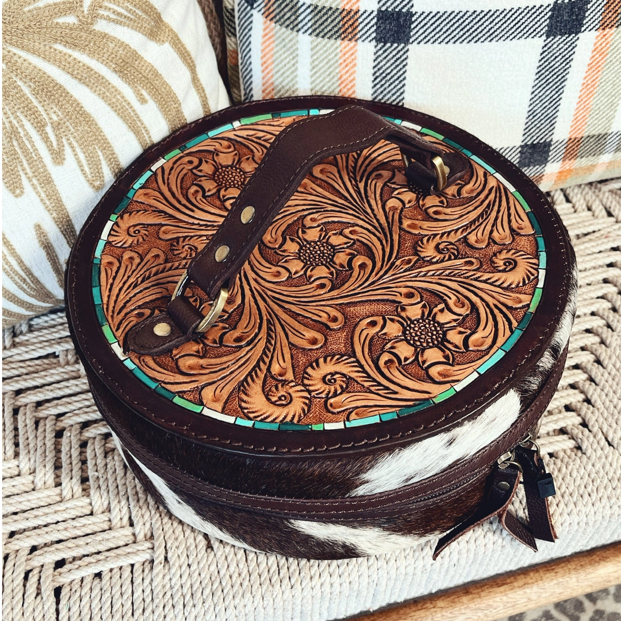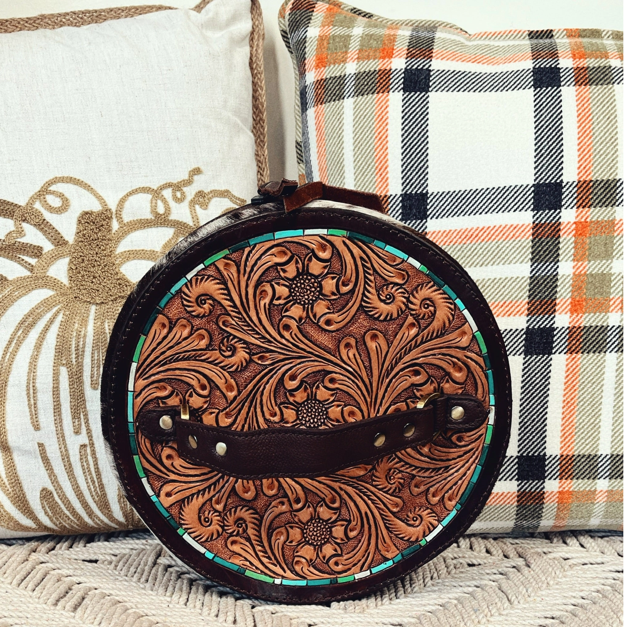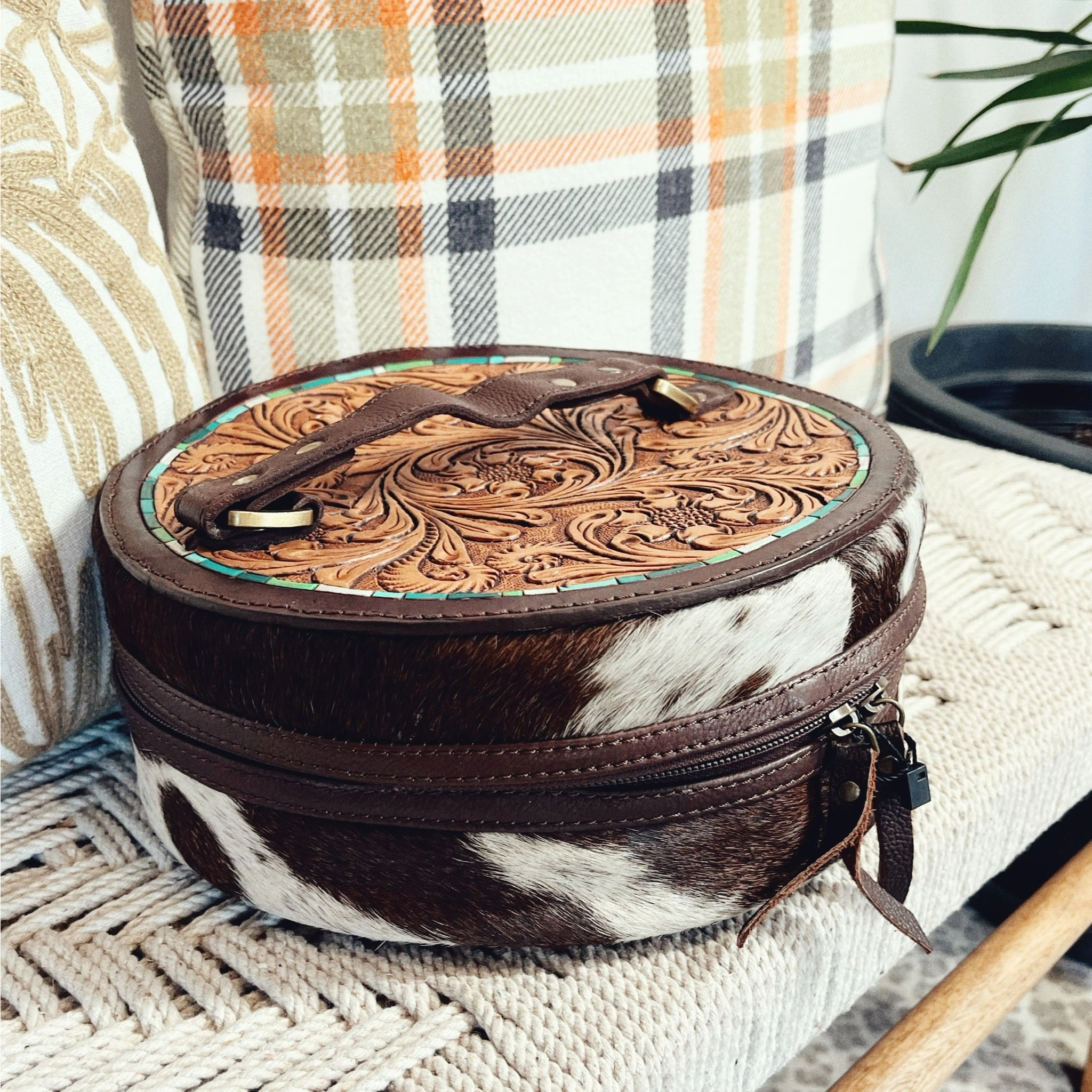 The natural cowhide adds a soft, textured element, contrasting with the smooth leather tooling.