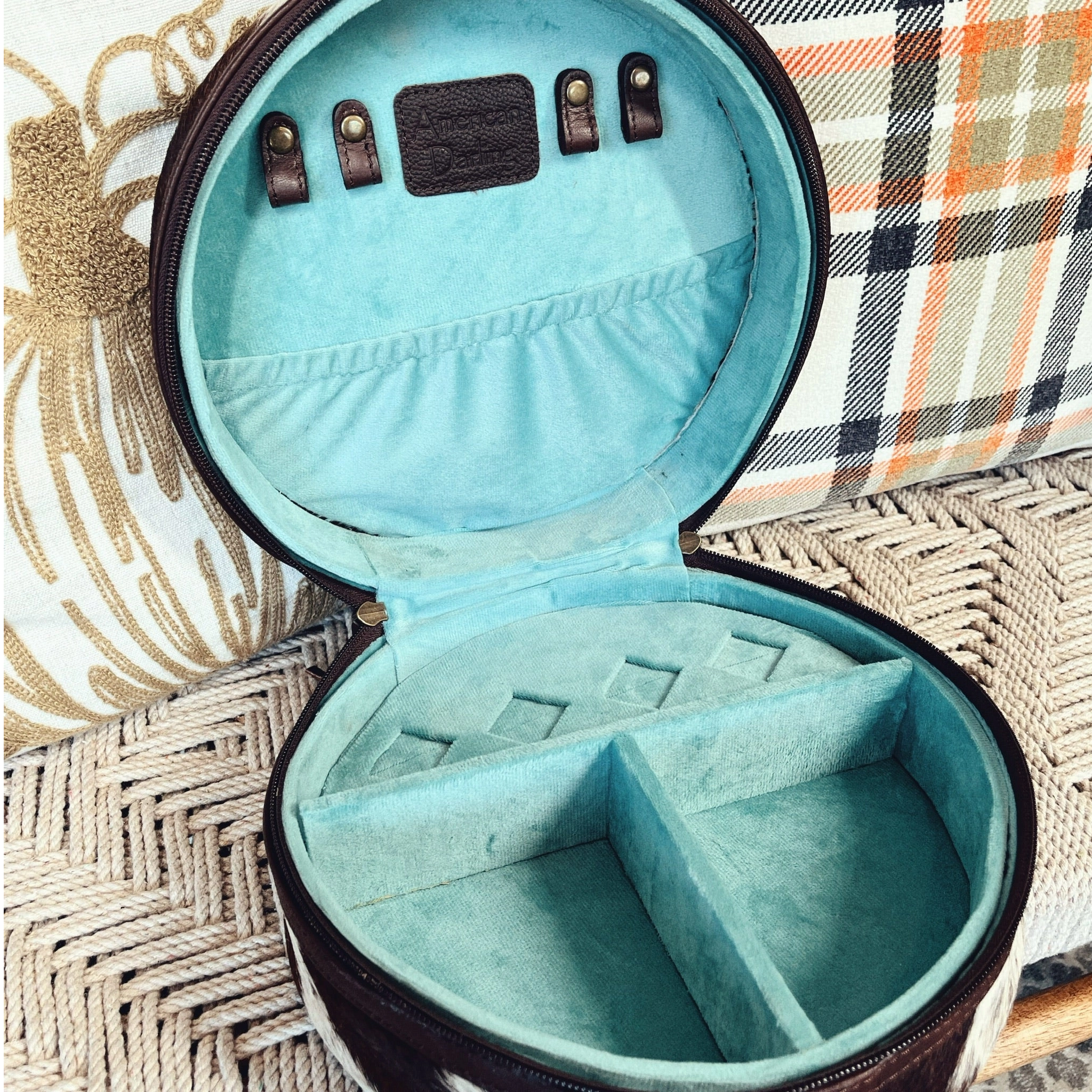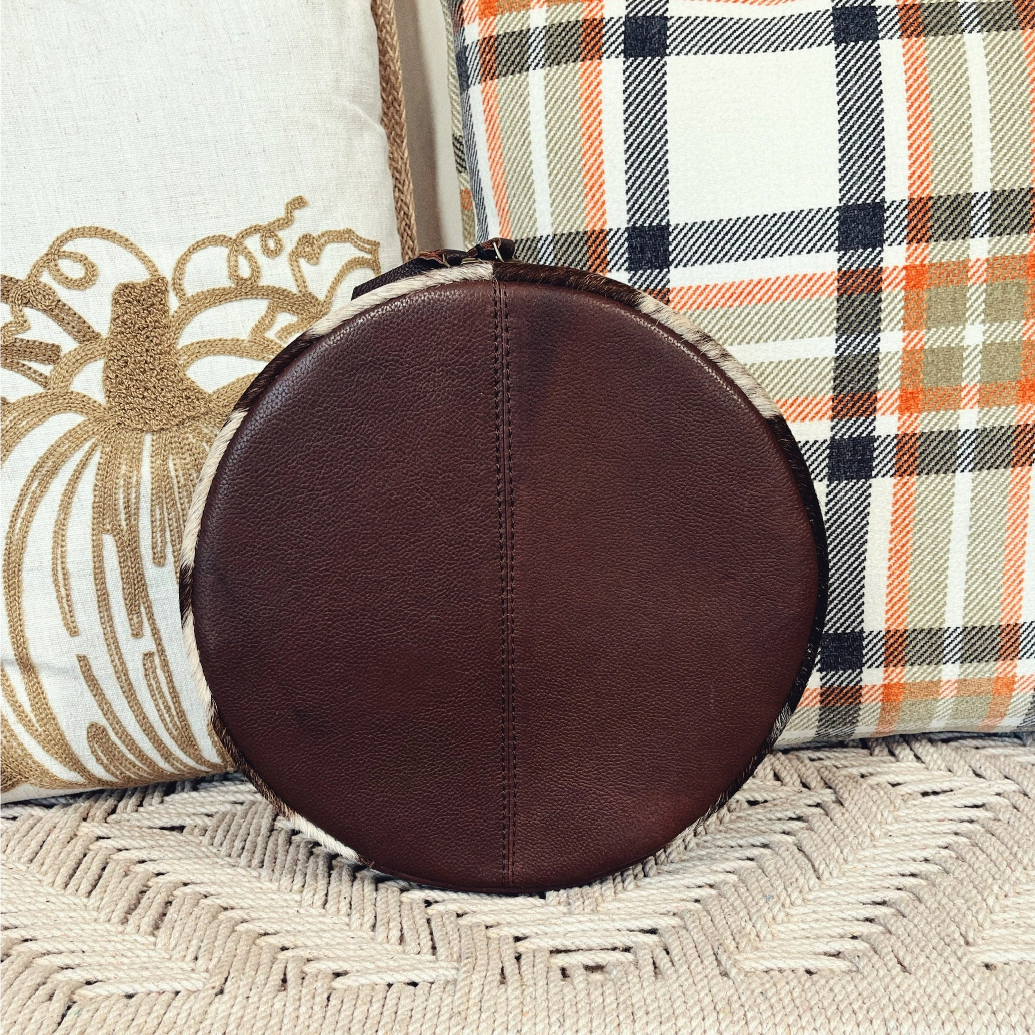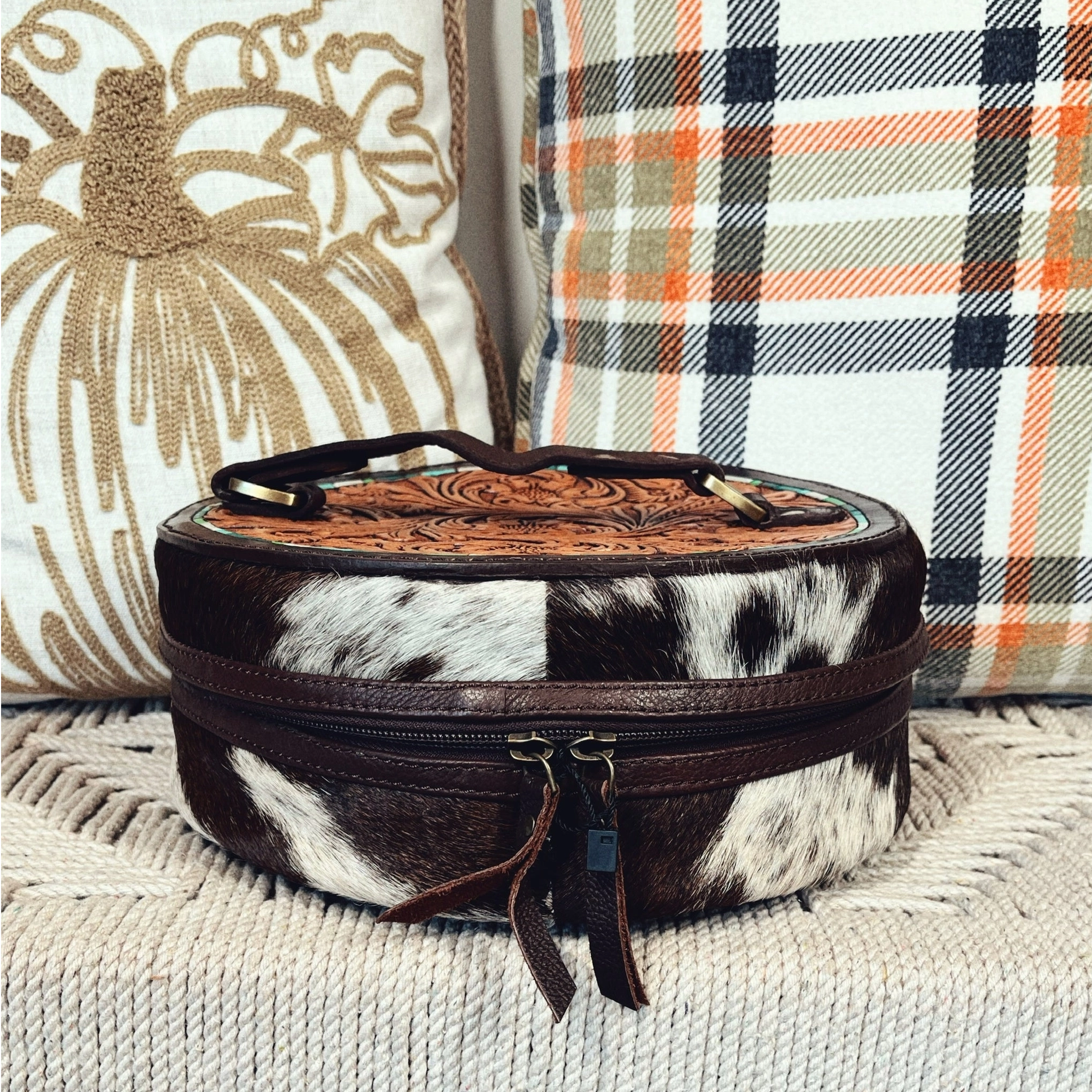 The natural cowhide adds a soft, textured element, contrasting with the smooth leather tooling.