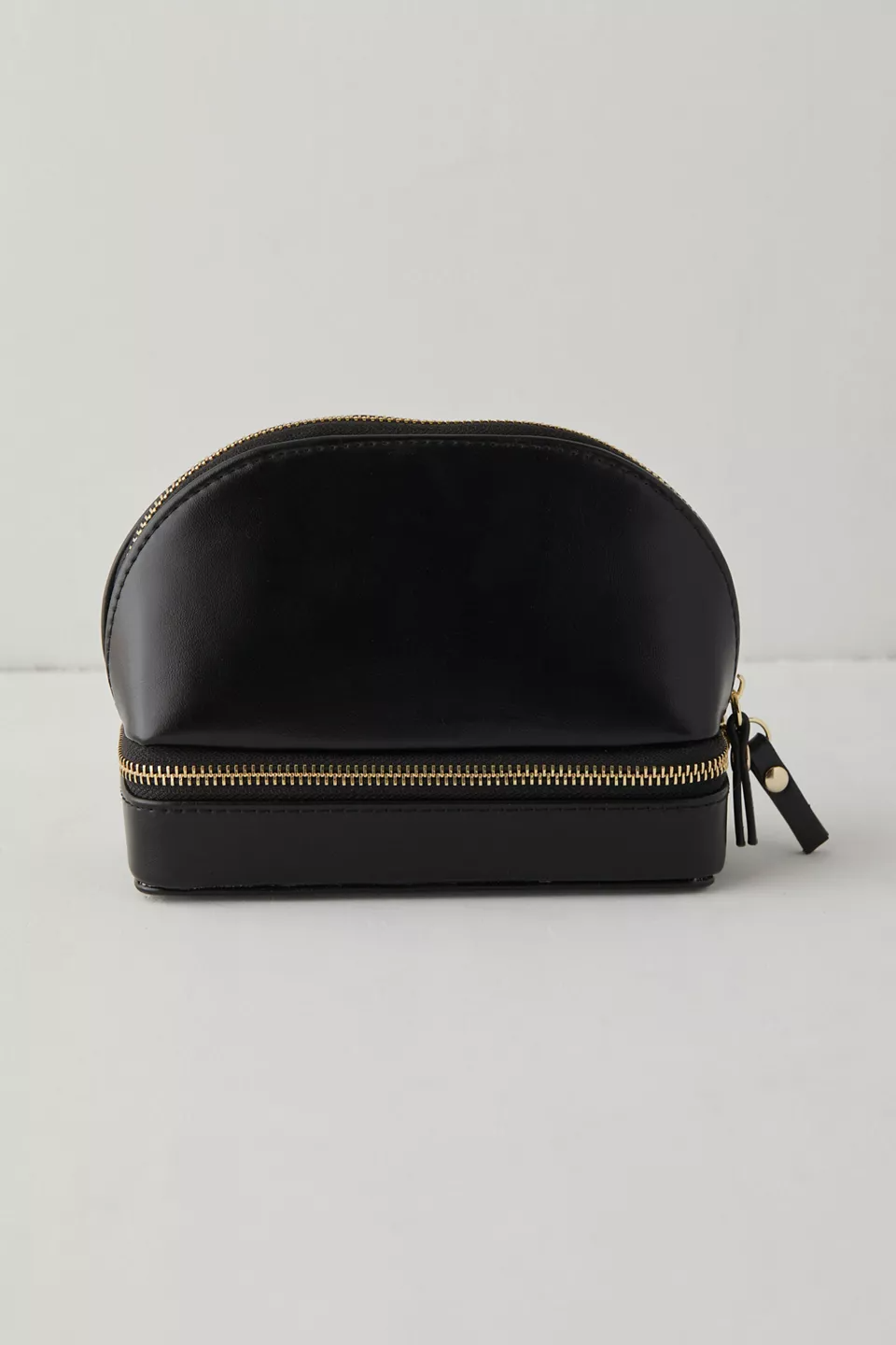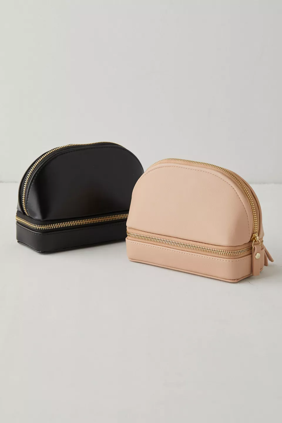 Carry your twinkling treasures and your makeup essentials, too, in this travel jewelry case from vegan leather lined with anti-tarnish microsuede, this jewelry case features a cosmetic compartment on top with a jewelry compartment built into its base. Its jewelry compartment is equipped with a small mirror, two covered sections and ring rolls. Finished with gold hardware for a luxe look we love.
