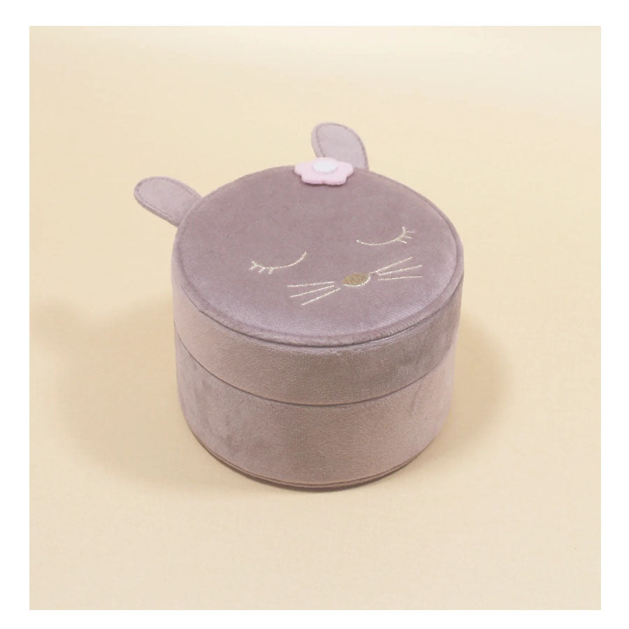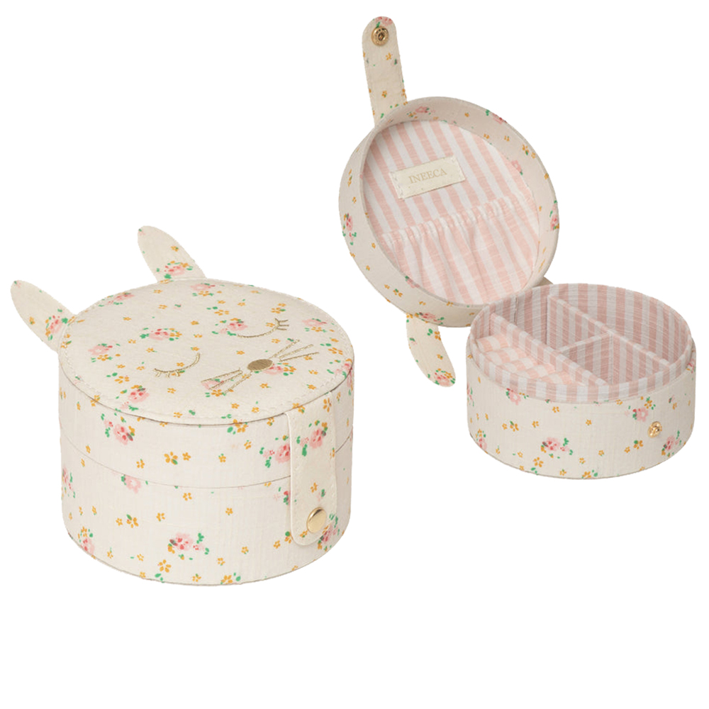 This cute Rabbit Ears jewellery box is the perfect place to keep all your Rockahula jewellery and favourite treasures safe! Featuring a gold embroidered bunny face, two floppy ears and made in our beautiful tiny blossom fabric, it opens to reveal three compartments, a slip pocket and a dedicated space to slot earrings and rings. Lined with sweet stripy fabric.