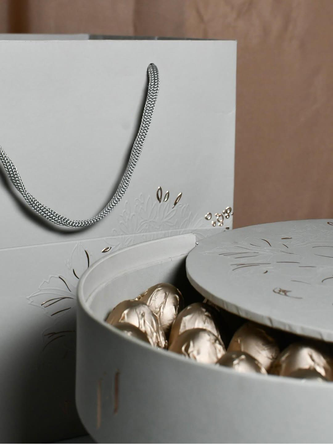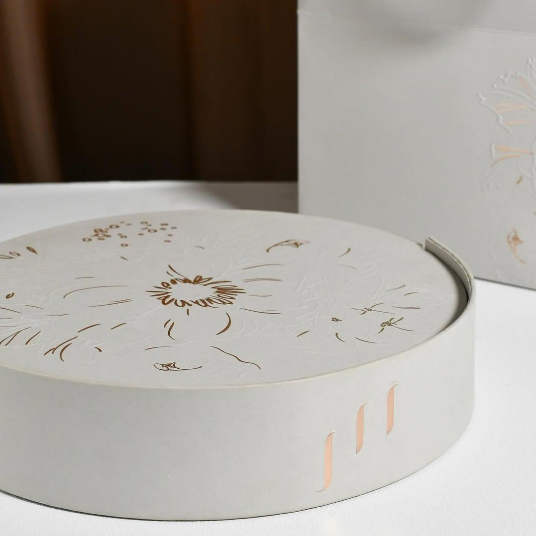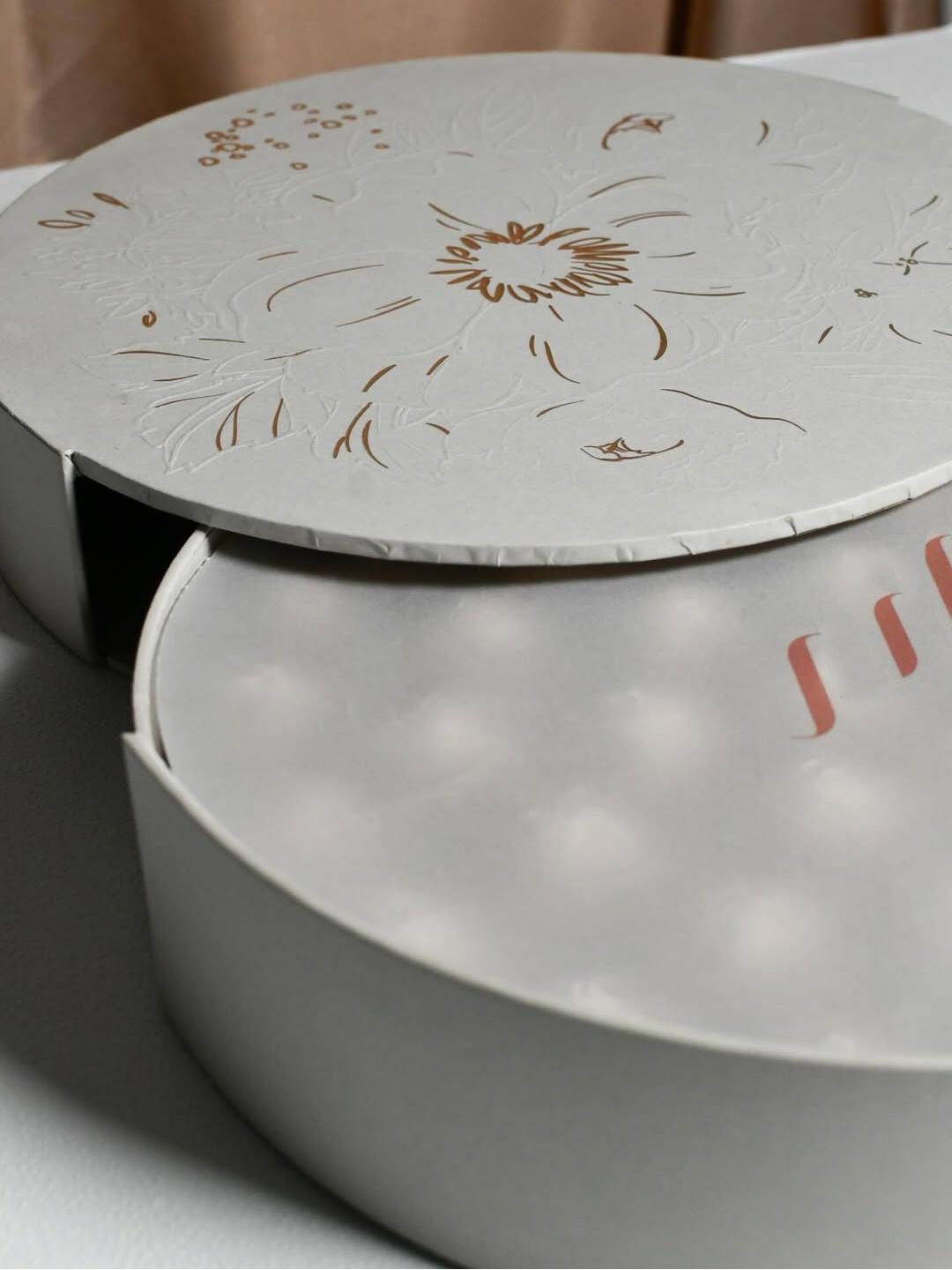 This rotating, multi-purpose luxury gift box features an elegant round shape and exquisite craftsmanship. The lid and body incorporate gold floral embossing and openwork design, with delicate and lively floral lines, while gold accents add a touch of understated luxury. It's a high-quality choice for storing delicious treats and as a gift, suitable for holding various delicacies such as chocolate truffles, candies, pastries, desserts, macarons, and dates.