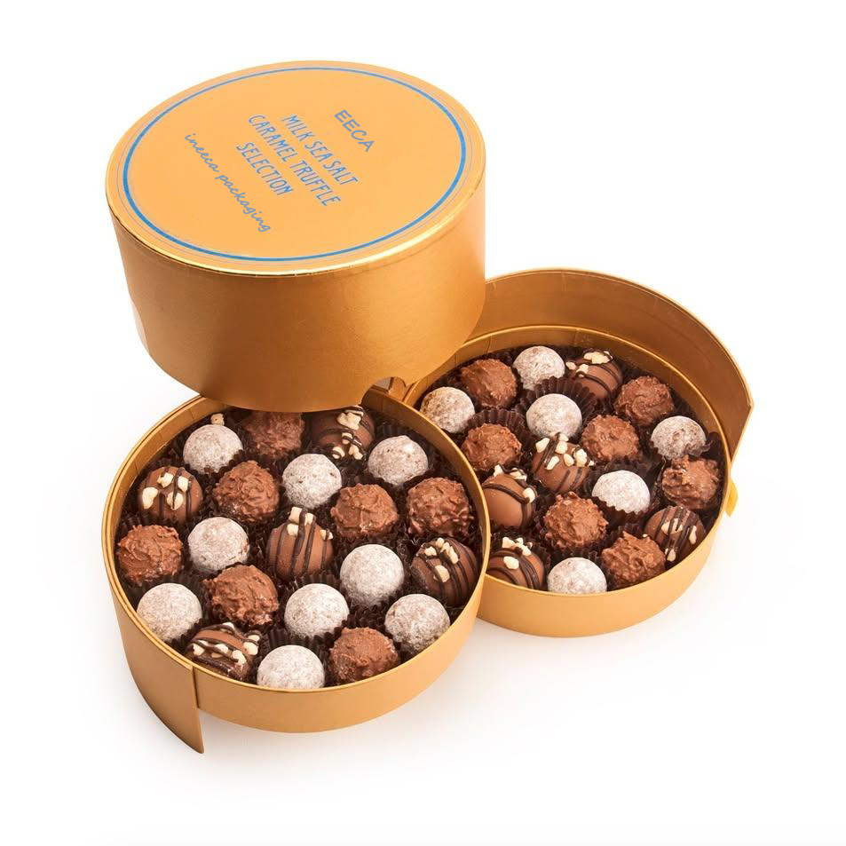 This chocolate gift box features an exquisite design. Its refreshing stripes and soft color palette, available in pink and white, blue and white, and other colorways, exude elegance and sweetness. The round box features a clever twist-open lid that reveals tiered compartments, allowing for easy storage while displaying the chocolates beautifully. It's perfect for personal use or gift wrapping.
