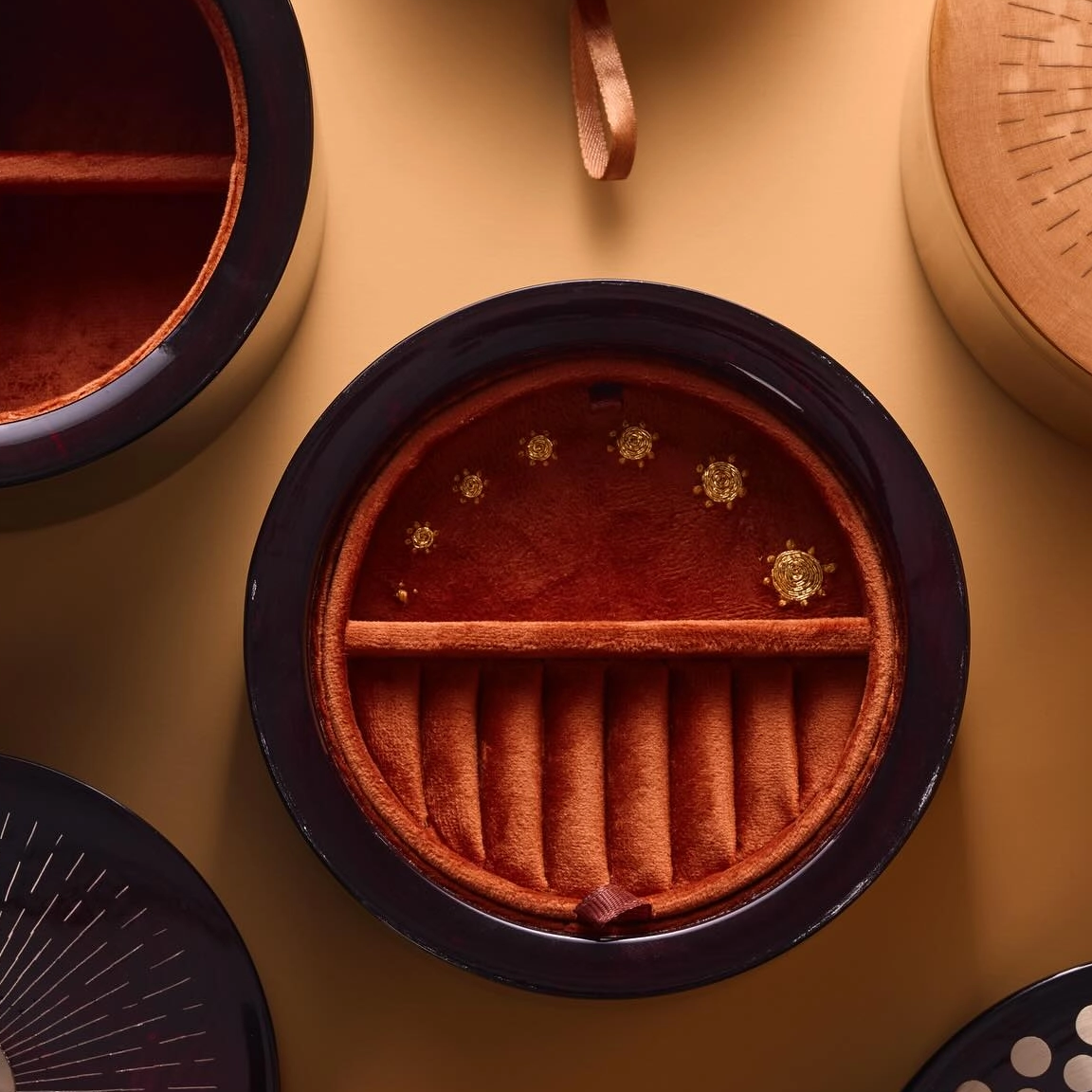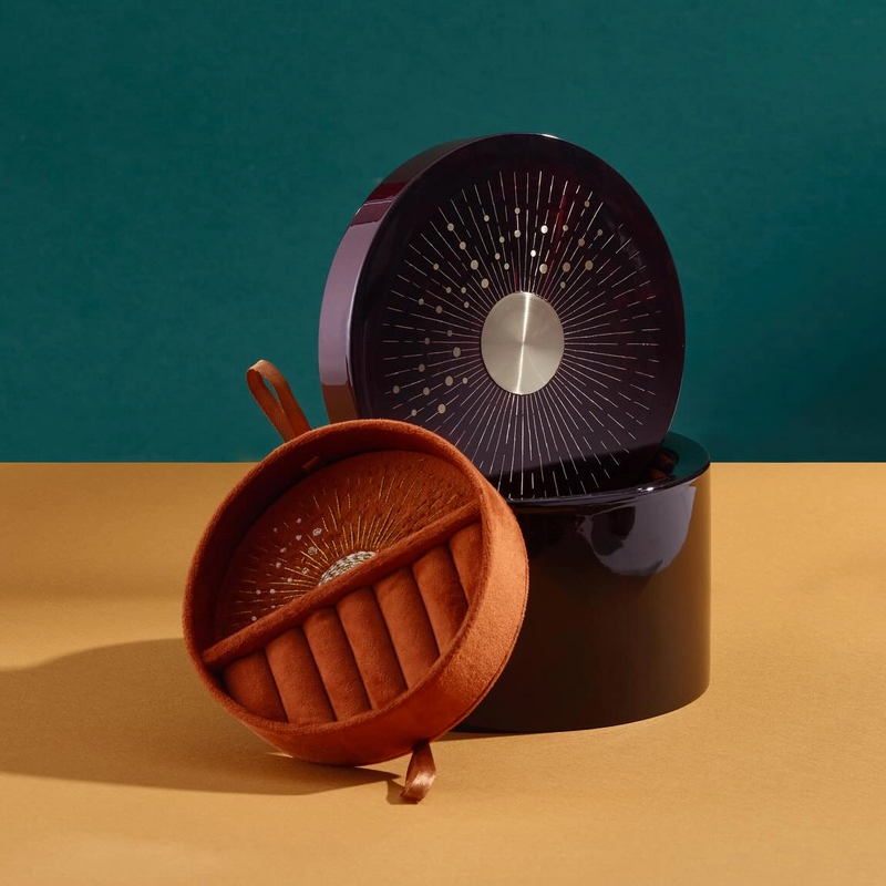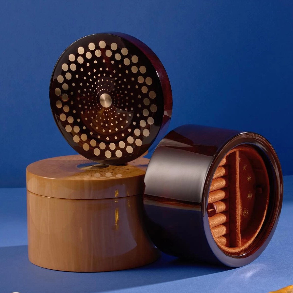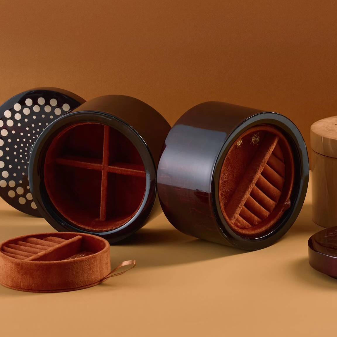 Material & Texture: Crafted from smooth, polished wood (available in deep lacquered dark wood and warm natural light wood finishes), it features a luxuriously soft terracotta velvet lining to protect delicate jewelry from scratches.