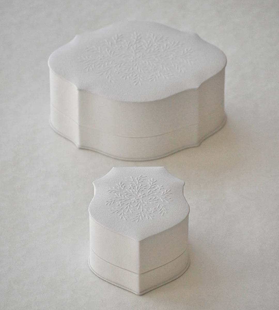 This box is a custom-made gift box for wedding jewelry. The outer layer is made of finely textured velvet, while the inner layer is made of soft white flocked fabric, offering a gentle touch and protective comfort. The box features an embossed floral pattern with delicate lines and a subtle relief texture. The irregularly shaped edges are rounded, making it both unique and harmonious. It's perfect as a ring box, wedding favor box, or small storage box.