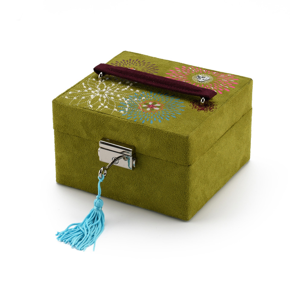 Exterior: Covered in a soft olive-green fabric, the box features vibrant, firework-inspired embroidery in pink, blue, and white, plus a deep burgundy fabric handle for easy carrying. A sleek metal lock (adorned with a light blue tassel) keeps your items secure.