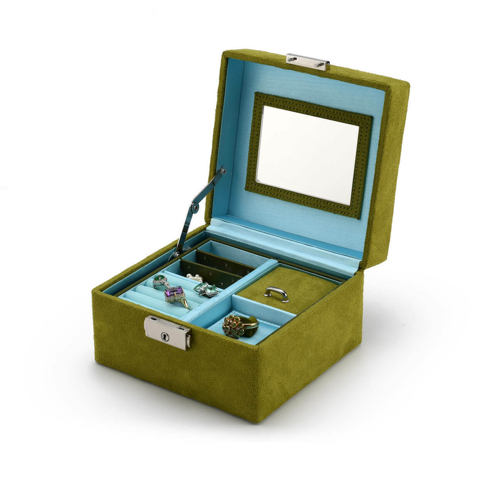 Interior: When opened, it reveals a bright turquoise lining. The lid has a built-in mirror for on-the-go styling; inside, there are divided compartments, ring slots, and a small lift-out tray—perfect for organizing rings, earrings, and small accessories.