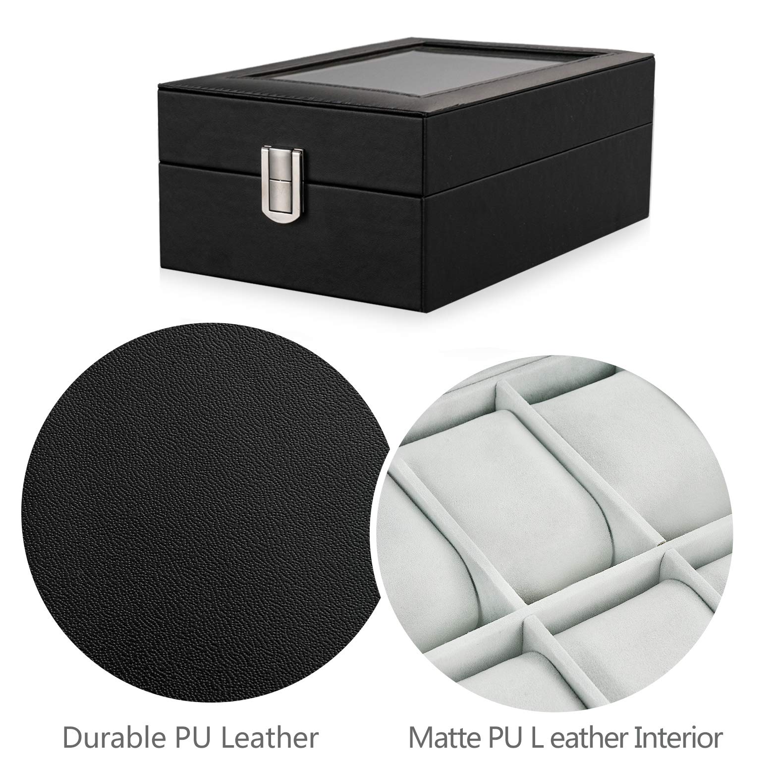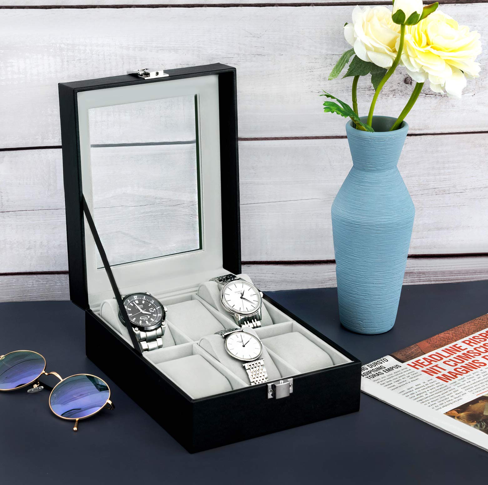 Wholesale 6 Slots Transparent Hinged Lid PU Leather Case Organizer Watch Display Wooden Watch Box